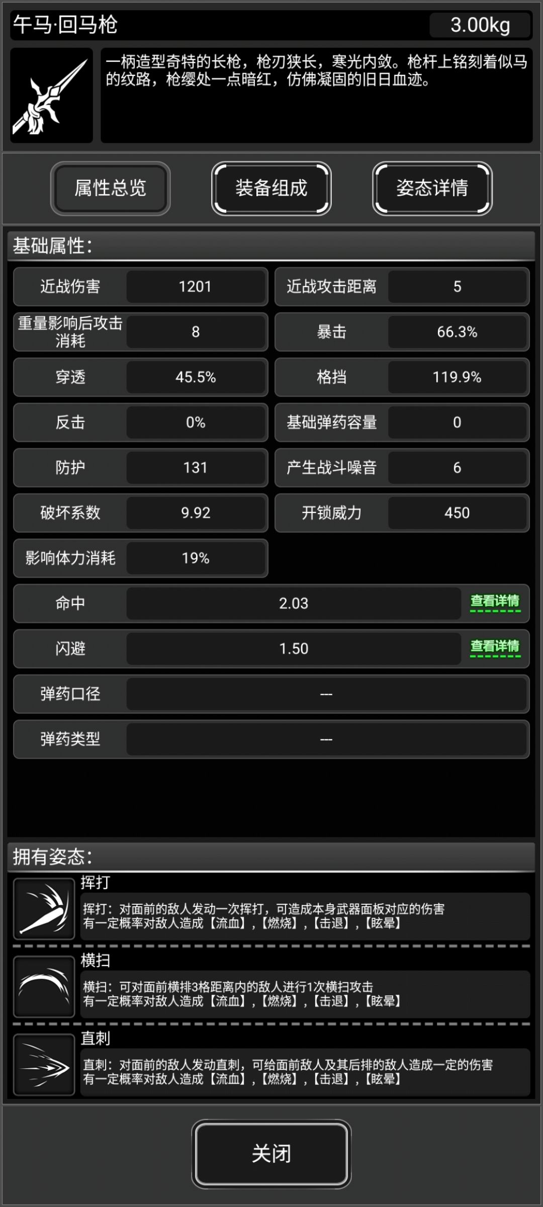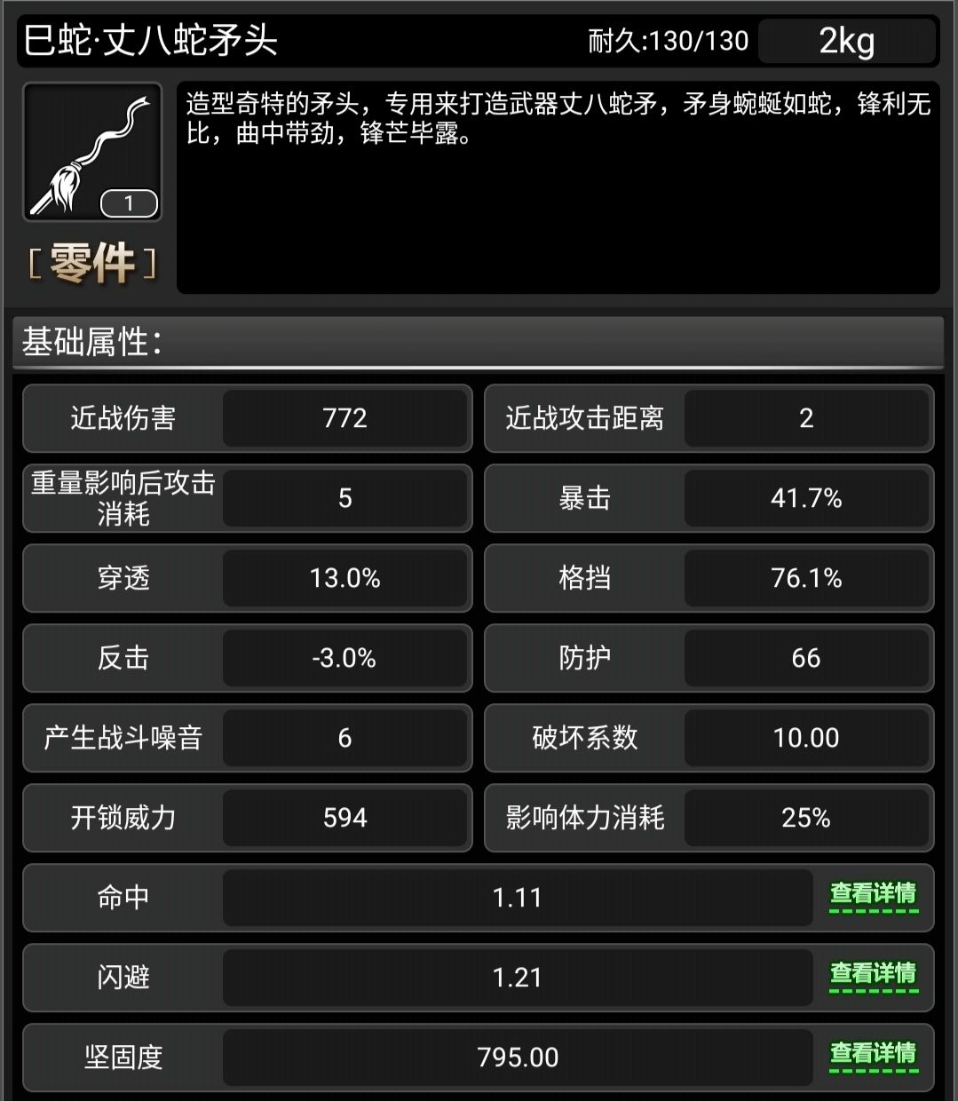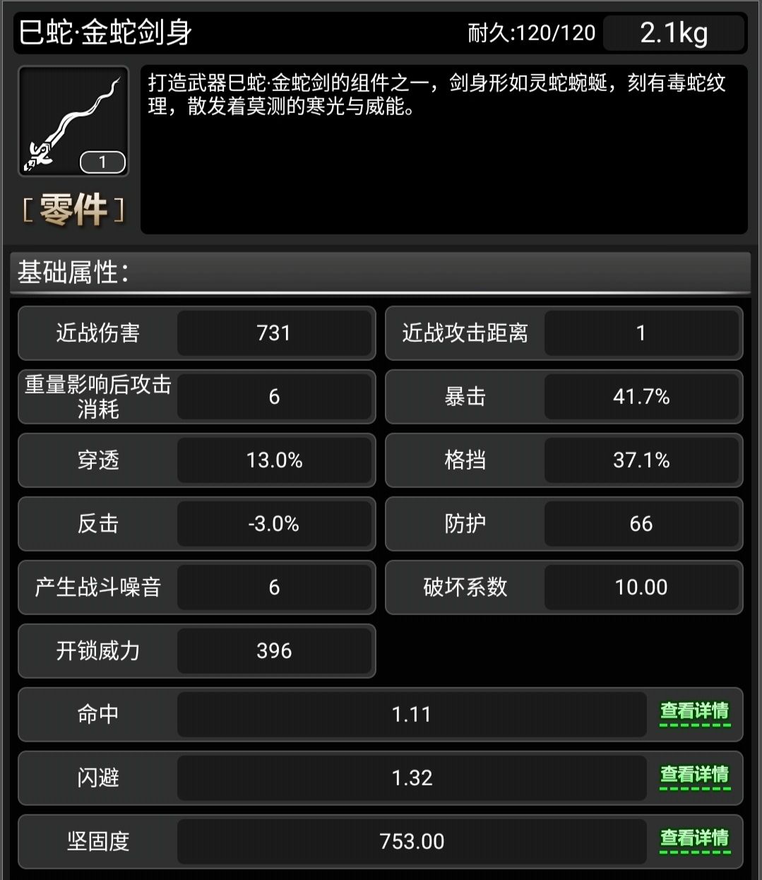 一把中规中矩的武器,但群体伤害是个加分项目。 此武器无原身。 可以看到,格挡和暴击率都是不低的,还有诸多特性,流血和上毒,伤害也可观,有击退和眩晕概率。 下面来看看满配 可以看到有一个特殊姿态,狂蛇逆血,这个就是个小群体攻击。 格挡率高,可以用这个姿态来格挡 消耗的耐久也不算多 再来看看维修消耗 7修会溢出很多,差不多两个六修修满。 综合来说,比较常规,可以给到三颗星,但是呢,可以上多种状态,加上