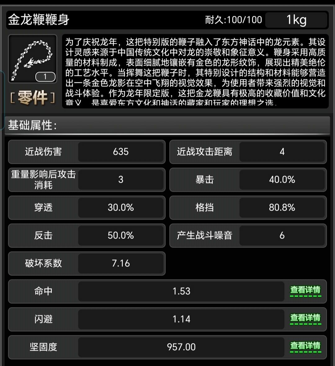 无天赋属性展示 这个面板,可以看出,金龙鞭在伤害不俗的同时,拥有着极高的格挡和反击,并且,暴击与穿透也同样不低。 姿态总览 伤害可以忽略,毕竟有三个重要因素影响着最终伤害:天赋 熟练度 握把 这里可以看到,金龙鞭的另一个大优点 可持盾! 姿态触发效果 可以看见,金龙鞭所有姿态都有3种强力控制效果,麻痹还可以克制机械怪! 总结:三大优点,面板高伤害与格挡,可持盾,高控制,战旗必备! 更多零件请关
