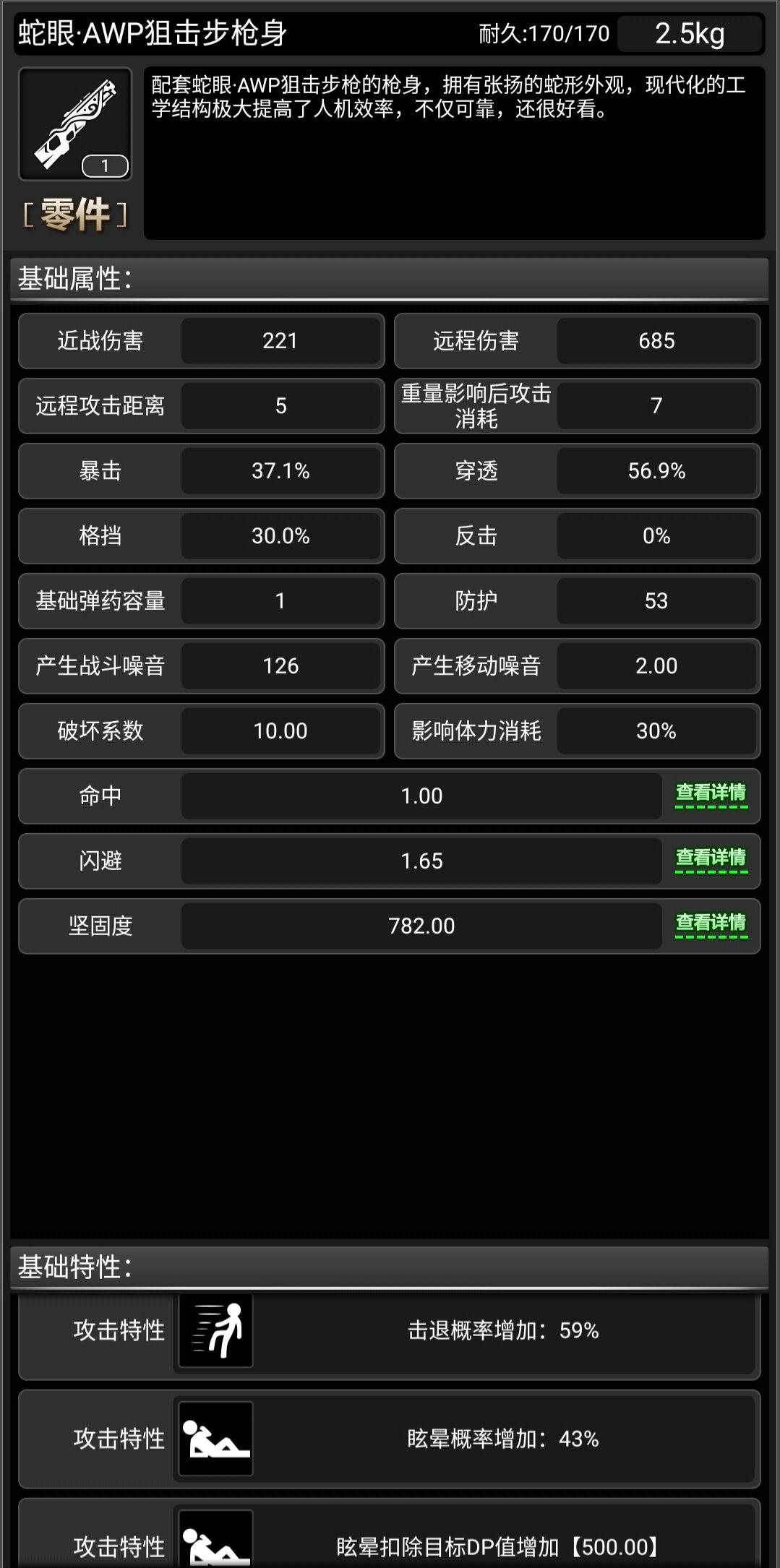 它的大分类和常规的blt狙击是一样,只有枪身不一样,其他都相同,详细配件和组成可以去看总帖的巴雷特,这里我就只给个最终面板和特殊姿态了。 再来看看满配,高穿高爆是个优点 本来我只想打三颗星的,看起来只是一把较为普通的狙,但是它有个伤害比较爆炸的姿态 好,有姿态,高伤害,三星半 再一看,百穿百爆,47的dp,无冷却,再加半颗星! 维修方面,依旧是不能台修,只能盒修,较为便宜,两个6修差不多就修满了 更