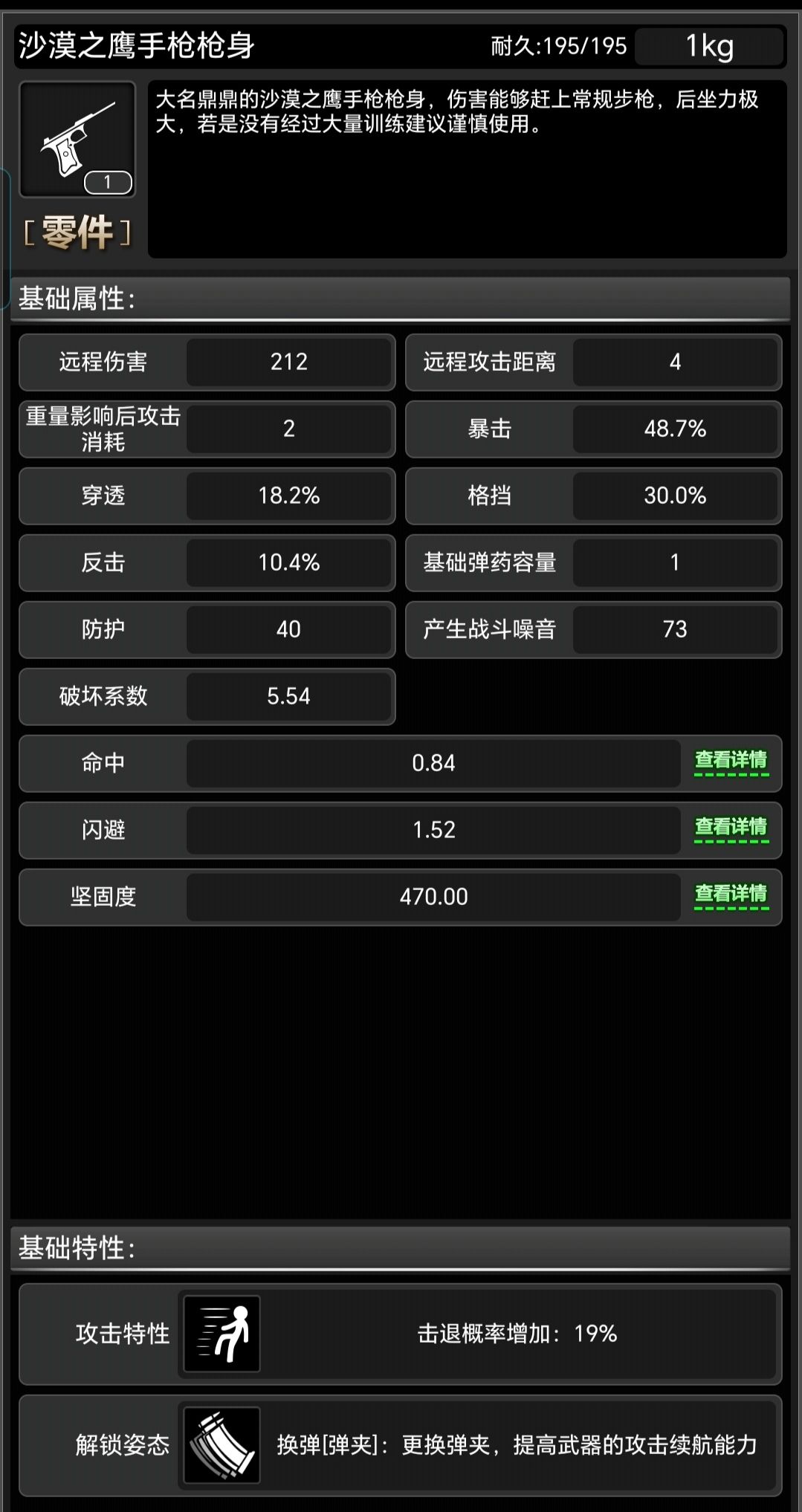 沙漠 之鹰手枪熟练度加成(现版本所有熟练度满级皆为7级): 每级加成:近战伤害+25;远程伤害+25;近战攻击消耗-1%;远程攻击消耗-1%;命中+0.02 满级加成:近战伤害+175;远程伤害+175;近战攻击消耗-7%;远程攻击消耗-7%;命中+0.14 沙漠 之鹰手枪大分类为:大口径手枪 组成:手枪枪身+手枪枪管+手枪击发器 注:该武器只能整个获取,不可单独获取配件 获取方式可至帖子末尾成品