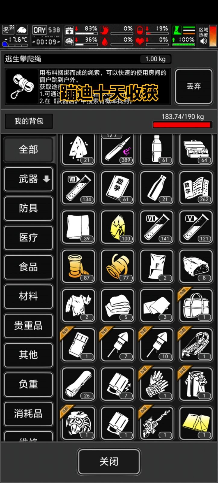 算了一下距离我满战需要蹦到1000天,开个帖子记录一下蹦迪效率 武器:碳纤维武士刀*10(右手放把极开作为防身武器) 天赋:战斗天赋均5(发帖的时候已经挂机挂到均6了) 防具:0.88左右的防毒,370以上的防御(陶瓷套),晕抗0.55以上(没有活动防具肯定是做不到的) 地点:防控中心2楼(二楼只要不堵门就不会刷岩胄) buff:4阶sg(2阶需要时不时补下血,3阶就可以一直挂机,4阶伤害更高回血