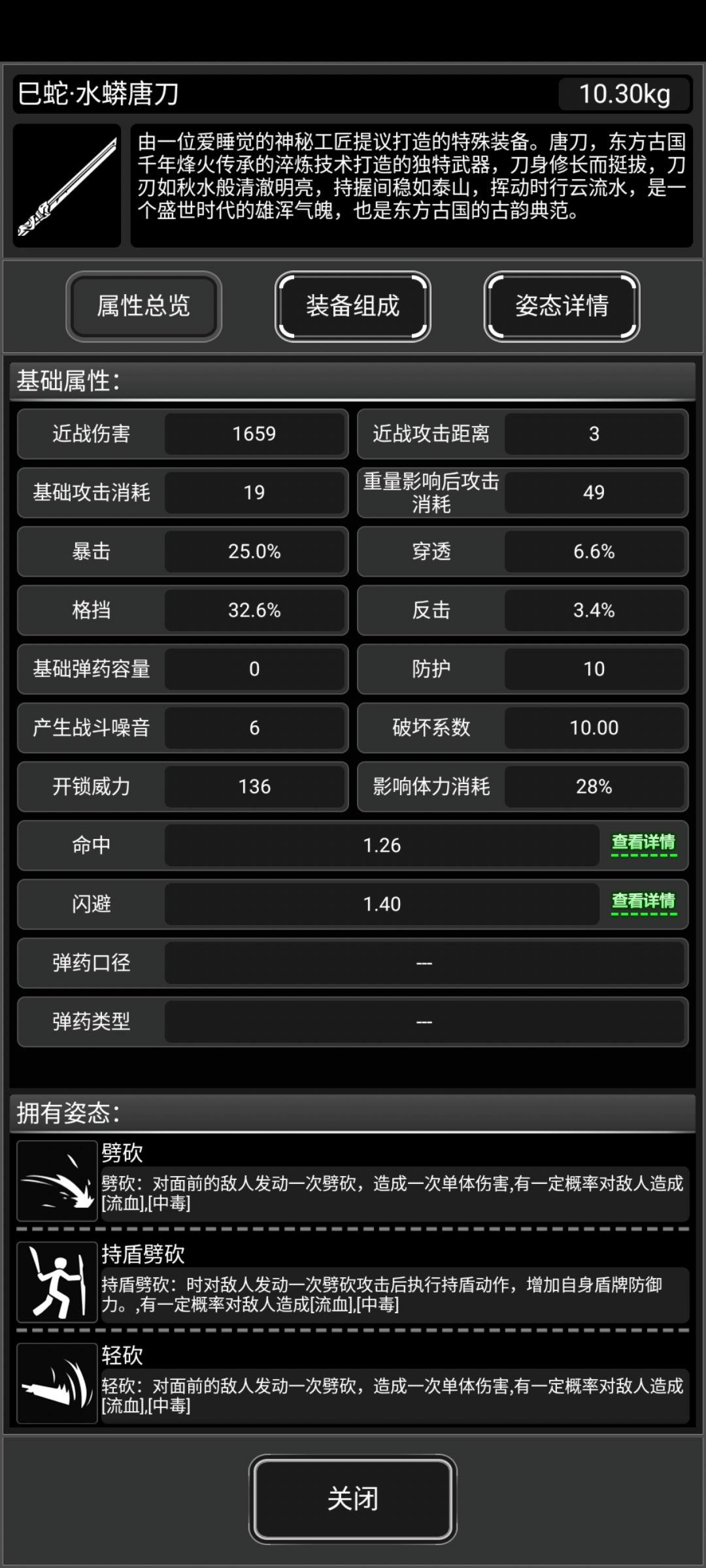 以下配置均为满天赋+4阶SG+精神充足 配件方面为蛇年配件 可作参考使用 巳蛇·金蛇剑 熟练度:刀剑类/持盾劈砍7级 维修:六修满溢出 满耐下260次持盾劈砍,附带流血/中毒 巳蛇·丈八蛇矛 熟练度:没练 维修:六修满溢出 满耐下280次狂蛇逆血,目前版本有bug,技能百分百击退+击倒,控制时间比技能CD长 巳蛇·雷峰塔 熟练度:无 维修:六修87 1个六修能开100次技能,附带束缚+眩晕 蛇吻·