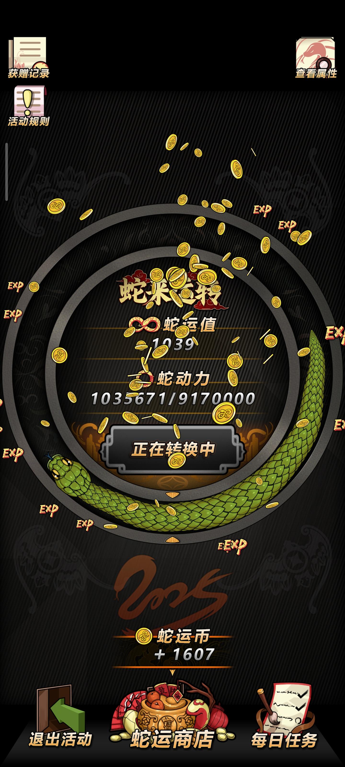 这个蛇每转一圈可以获得一定数量的蛇动力,蛇动力可以换取蛇运币,比例是666换一个,具体购买在底下的蛇运商店,装备攻略等我后续出。 然后就是赚取的效率,你兑换获得的蛇运币,还有充值1比1获得的蛇运币,都是可以获得经验值,在右上角查看经验值,和转换效率,等级越高蛇越长,转的更快。 活动期间充值和做任务可以获得蛇运值,蛇运值要比蛇动力高级,可以1比1转换成蛇运币。 然后就是关于蛇动力,累冲高的就比较安逸