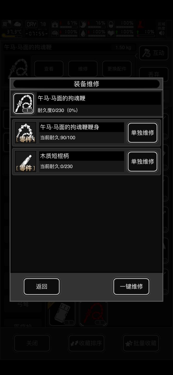 武器:马包(你没蛇包情况下)>马盾(你有唐刀)>马狙(修起来比蛇狙便宜差点熟练)>马鞭>电锯(没熟练被原版电锯吊打买旋风斩握把送锯子)马锤(配件)>马高斯(配件)>马克沁(蹦迪压子弹必备,如果你有蹦迪需求并且不想卡精力)其他收藏@防具:马头(清肥宅buff)其他收藏(包修活动套晕抗束缚抗增伤都没拉一地)@载具:bt(仅黑券bt马未兑换)>玛莎拉蒂(满配858速或者配负重525负重698速)