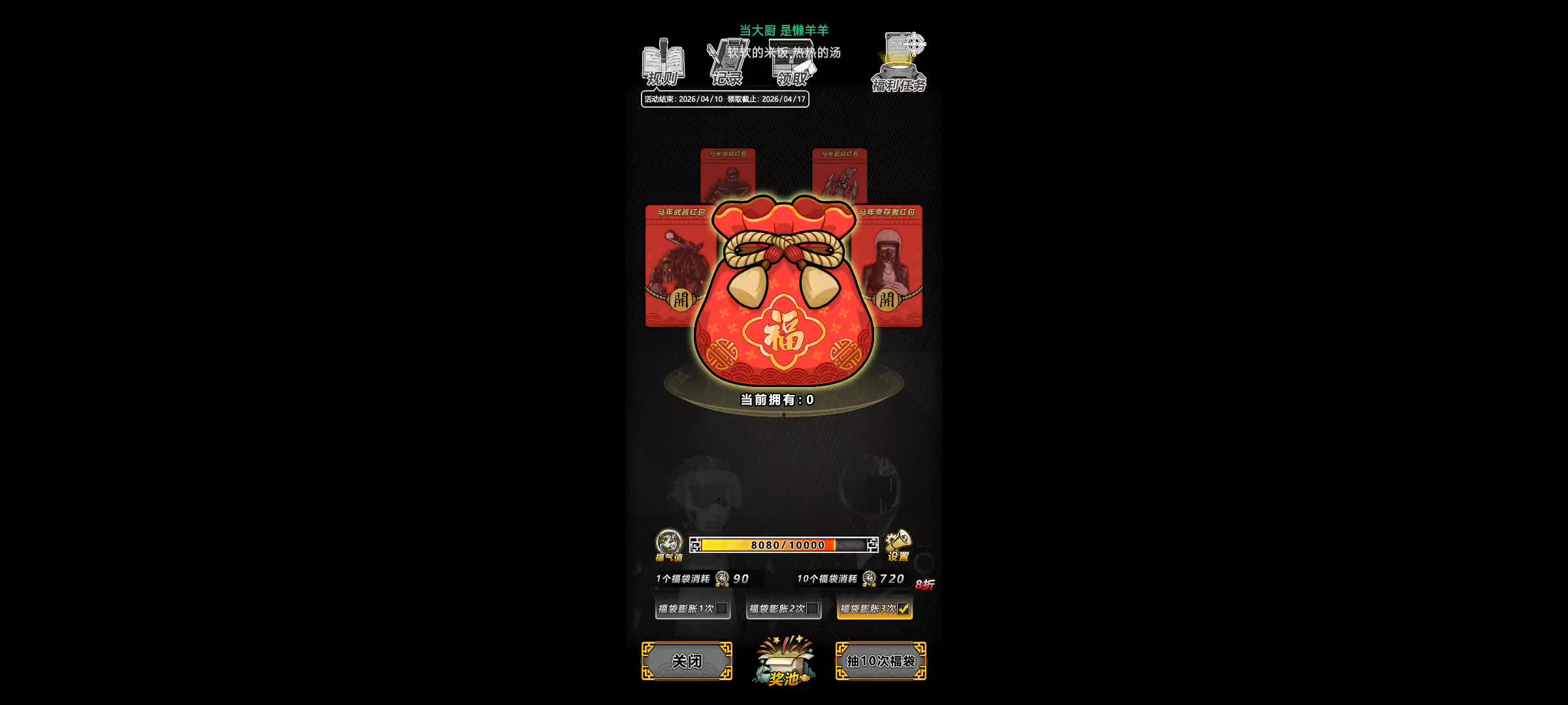 马年的活动和龙年一样,还好我做了龙年的攻略游玩规则比较复杂,总结下来就是两点1 无论零氪满氪,都不要买福袋,也不要用福气重置福袋池2 武器红包和自选武器是最有效的奖励,武器红包单抽出自选武器就用福气重置武器红包池抽取策略:1 不花信用点的抽取策略(省福气):不膨胀抽34次,然后膨胀三倍抽20次,如果前面34次出了武器红包,后面20次不膨胀,用福袋抽完福袋池,零氪全勤大概能十几