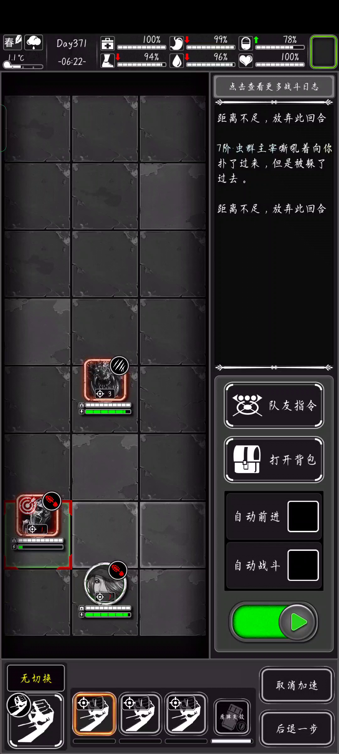 战棋模式开局背包里会送物资包,打开能获得斧子、木铲、小刀,只要用斧子就能打赢1~2阶僵尸(零天赋适用)。 视频中以3阶夜鬼为例,简单讲解了战棋模式如何看行动条,战斗中跑步,卡距离打怪的操作。#攻略大师#国产游戏#活下去#战棋#新手攻略