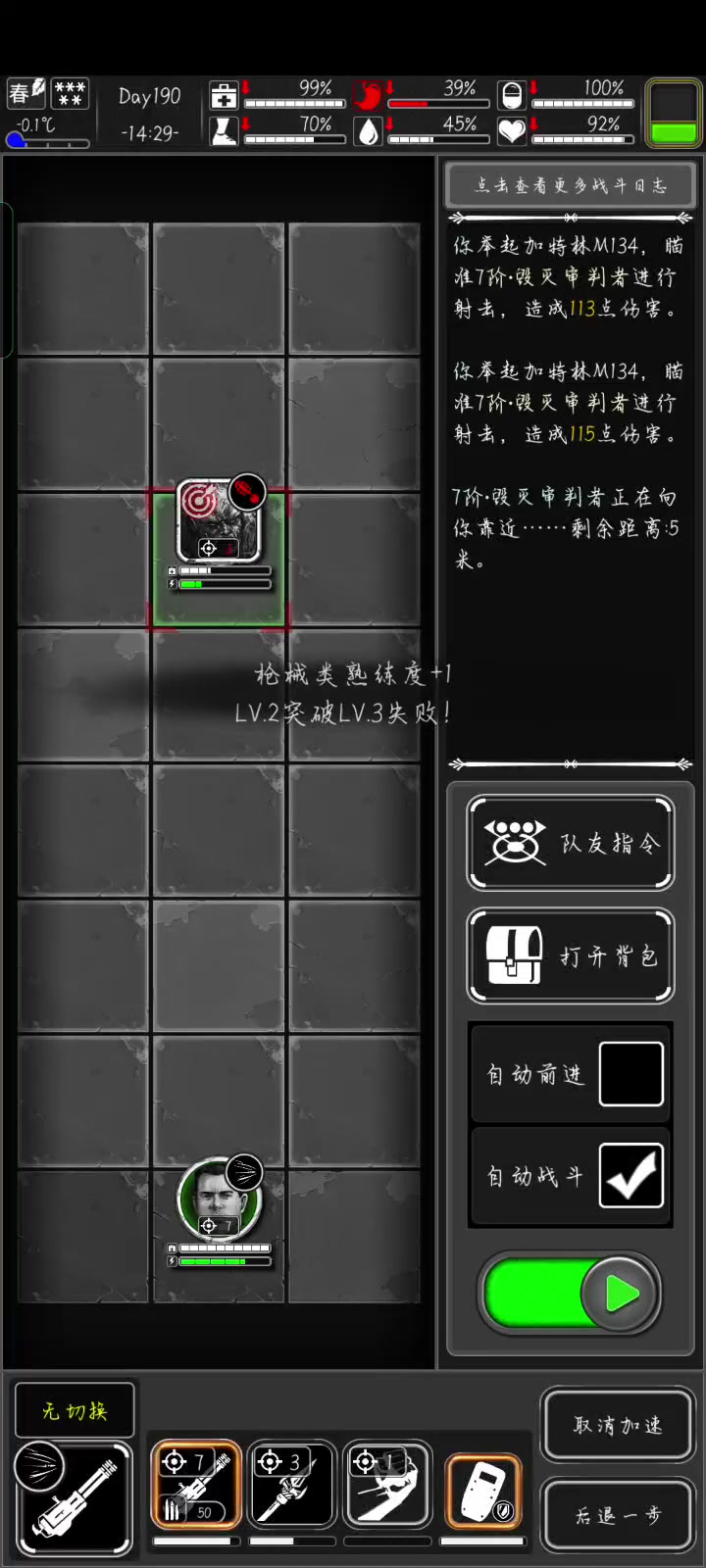个人意见,仅供参考 注意点:跟胃炎保持5格距离,胃炎行动值快满的时候点击jtl撤退;原地击倒可追加两锤;后退击倒可切空手上前一步后接锤一下,重复操作直到胃炎死亡,最稳健打法之一,切记不要贪,不要贪,不要贪