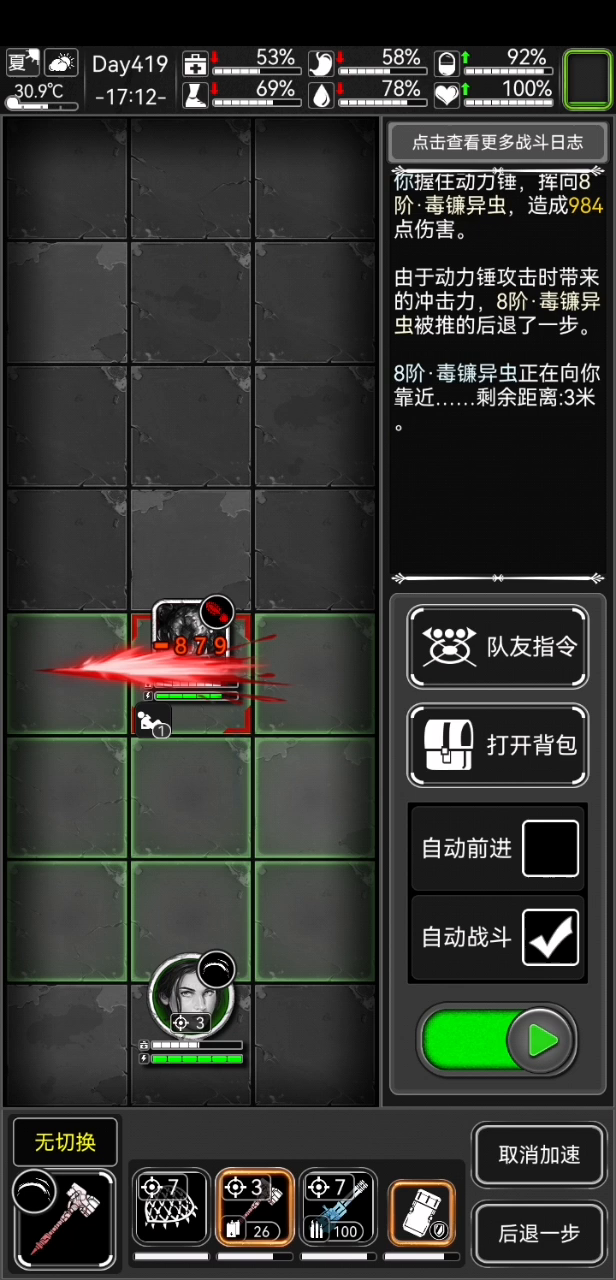 为了0天赋稍微快点10天,选了个简单档,,妹想到阿妹想到,坐地下8小时回复将近50体力,,,水不动天数,直接拉长了我这期视频的时间成本。。。。此视频主要演示了如何在第十天开通电台后用尸潮刮出6血,怪物选择:除了屠夫和腐木外的三个6阶怪,尽量寻找落单的6阶怪,旁边有其他怪的话尽量找小弩能迅速淦掉的,电网是用来打周围怪的,不要控住用猎刀一直a,当然你要做10把放包里当我没说。最开始和最后演示了如果没出货或者失误狗带如何用云存sl回来重打。友情提示,本次视频选择的怪物血厚点但是移速也就是读条稍慢,其他两只可打6阶怪速度稍快,节奏自行掌握。另外如果你耐心足够想用猎刀刮7血的话,可以选择诡首和栜蜥,记得猎刀多做几把。(个人不建议这么干,哪个阶段就做哪个阶段该做的事,6血出重弩换军步换加特L突突不香么)