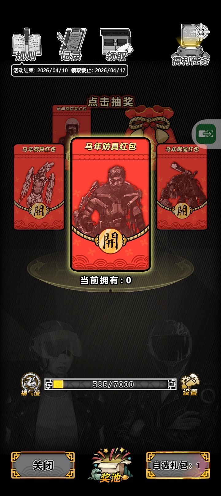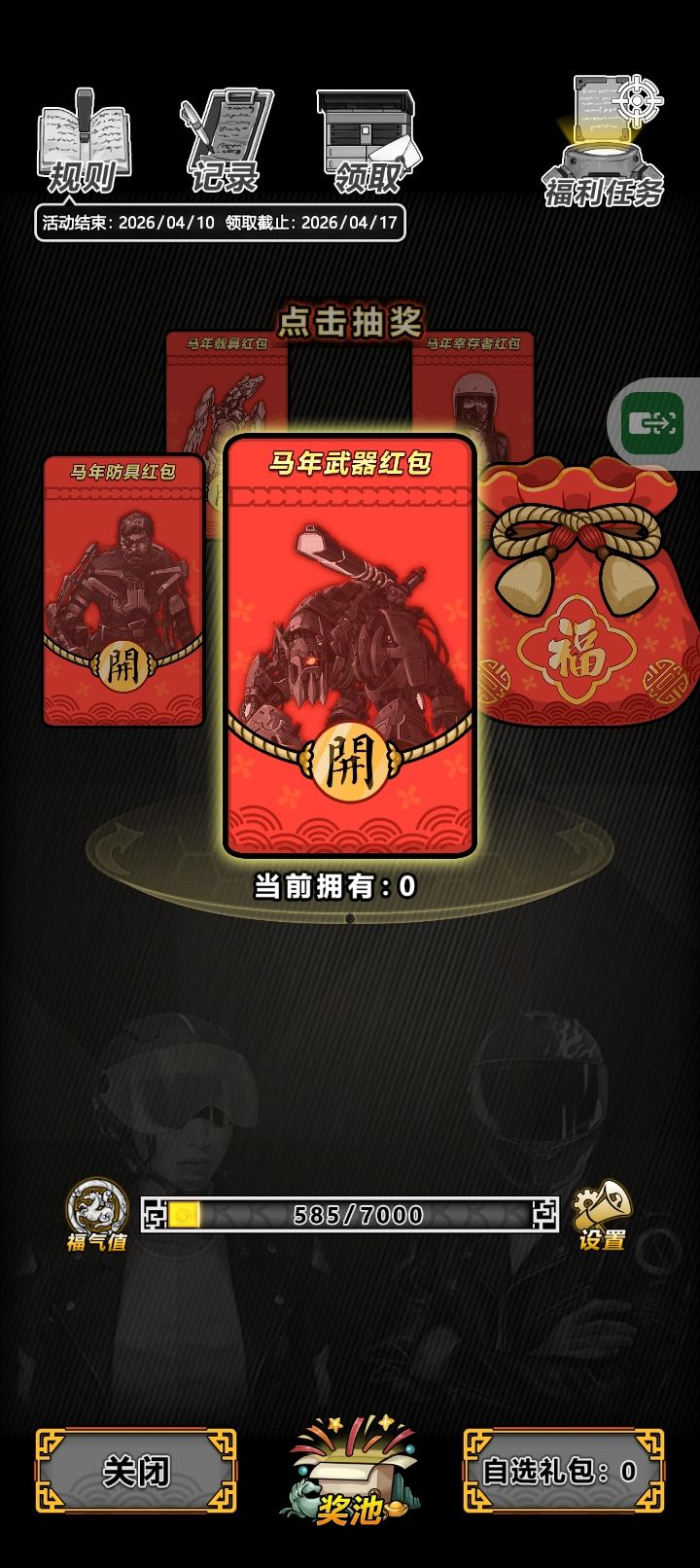 马年的活动和龙年一样,还好我做了龙年的攻略游玩规则比较复杂,总结下来就是两点1 无论零氪满氪,都不要买福袋,也不要用福气重置福袋池2 武器红包和自选武器是最有效的奖励,武器红包单抽出自选武器就用福气重置武器红包池抽取策略:1 不花信用点的抽取策略(省福气):不膨胀抽34次,然后膨胀三倍抽20次,如果前面34次出了武器红包,后面20次不膨胀,用福袋抽完福袋池,零氪全勤大概能十几