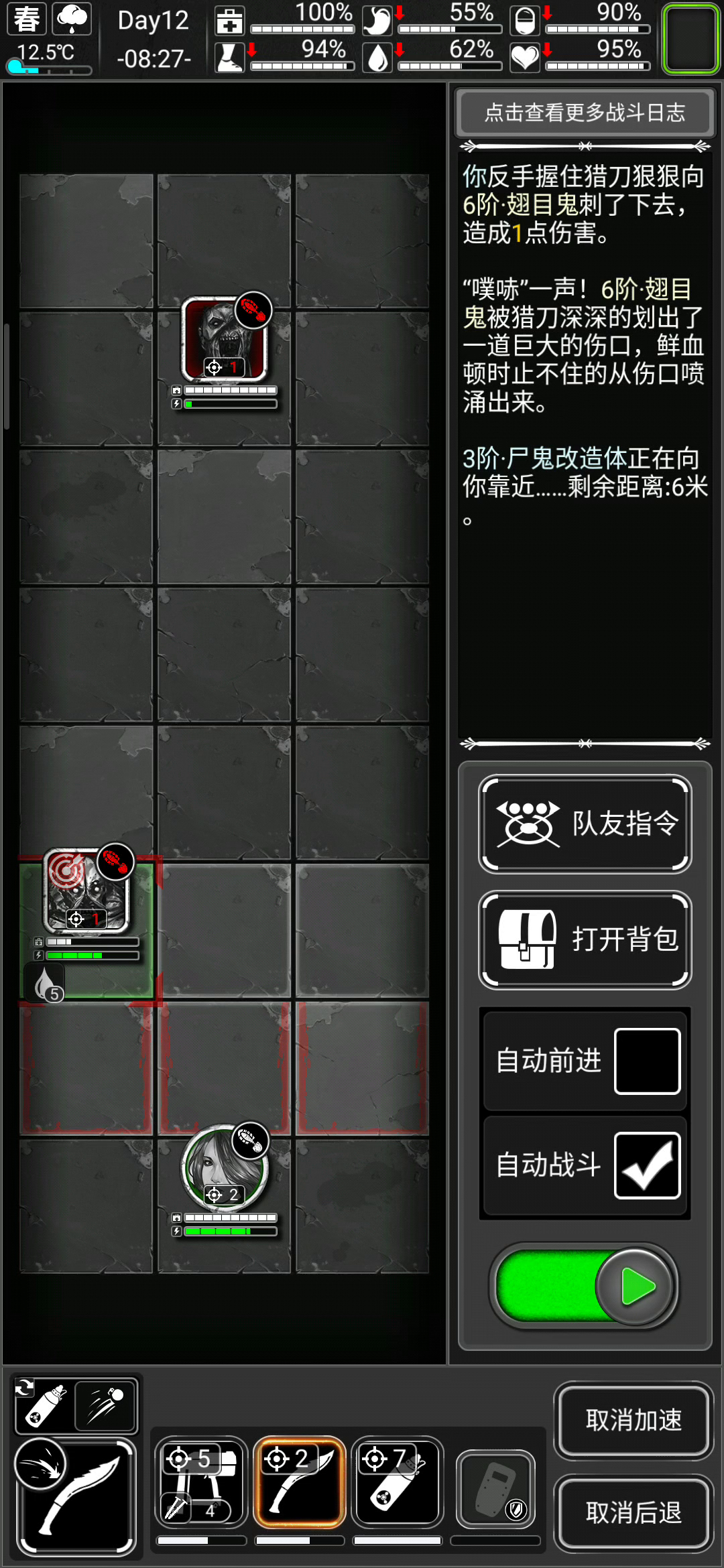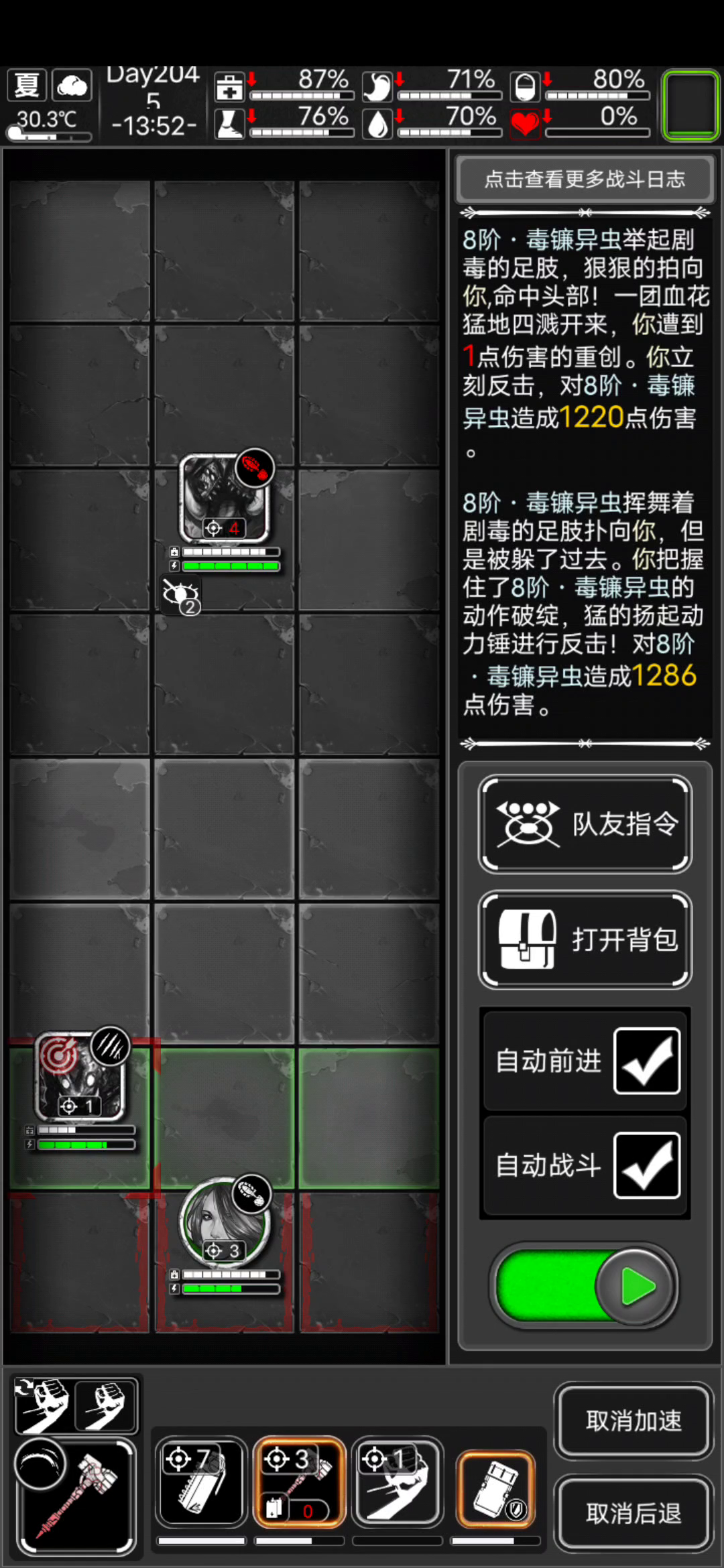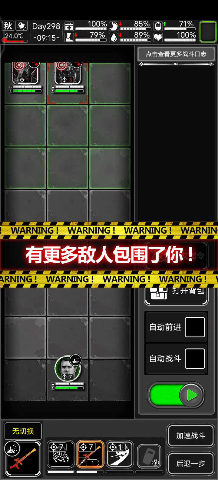 [挣脱束缚]按钮,使用一次300DP有概率挣脱束缚。挣脱失败层数减一回合结束,挣脱成功继续回合。 战斗中可以使用道具清除debuff 【中毒】可以用【抗生素】清除 【流血】可以用【绷带类】道具清除 【燃烧】可以用【水】类道具清除