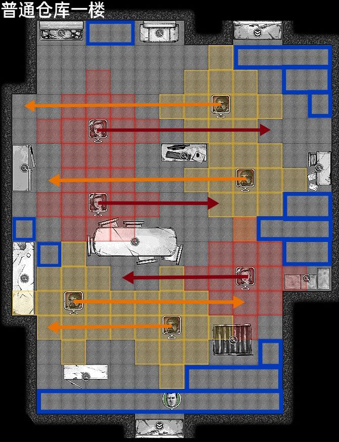 橙色箭头与红色箭头为守卫的行动轨迹。蓝色框为安全区域,守卫永远无法侦查,可以在这些区域恢复体力或等待守卫移动。