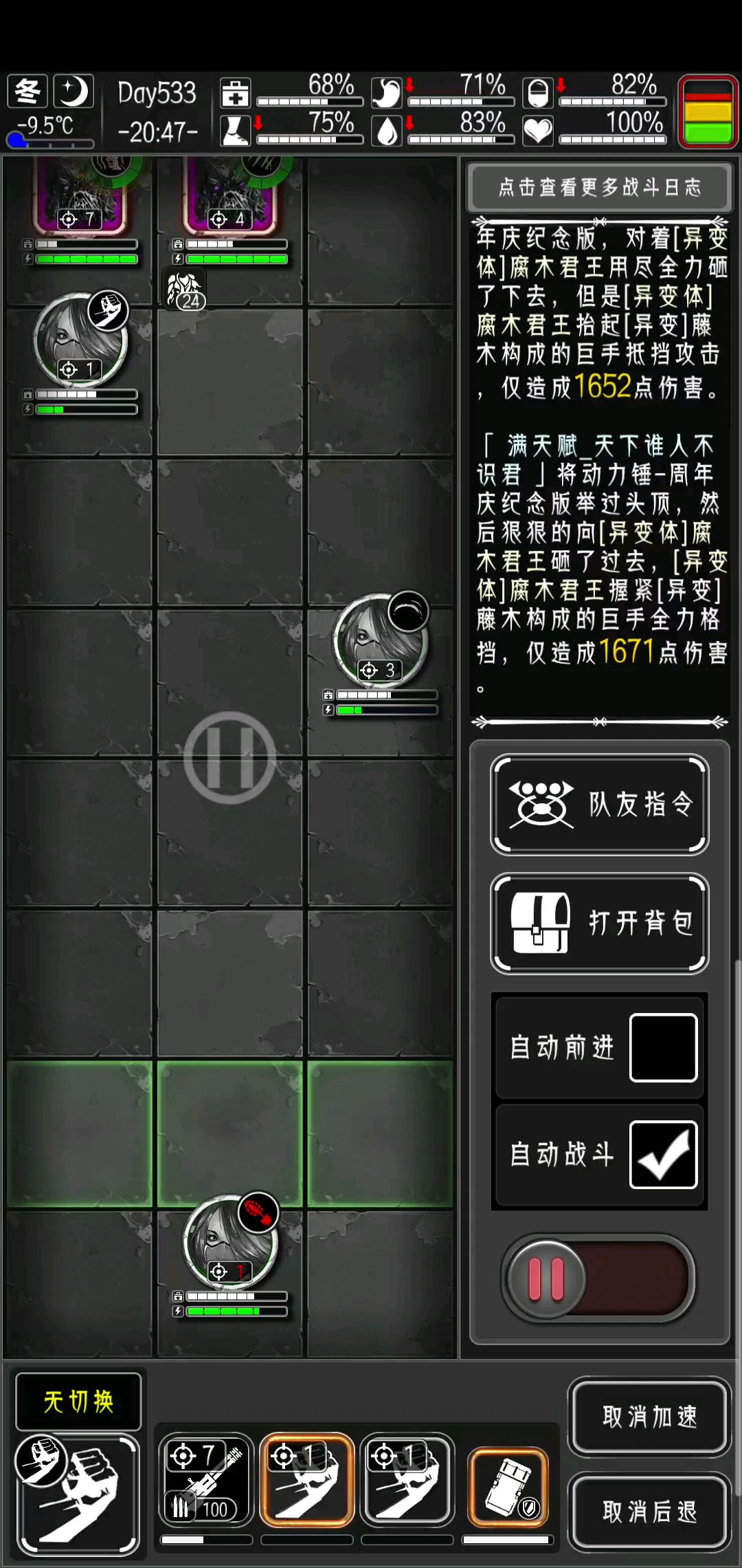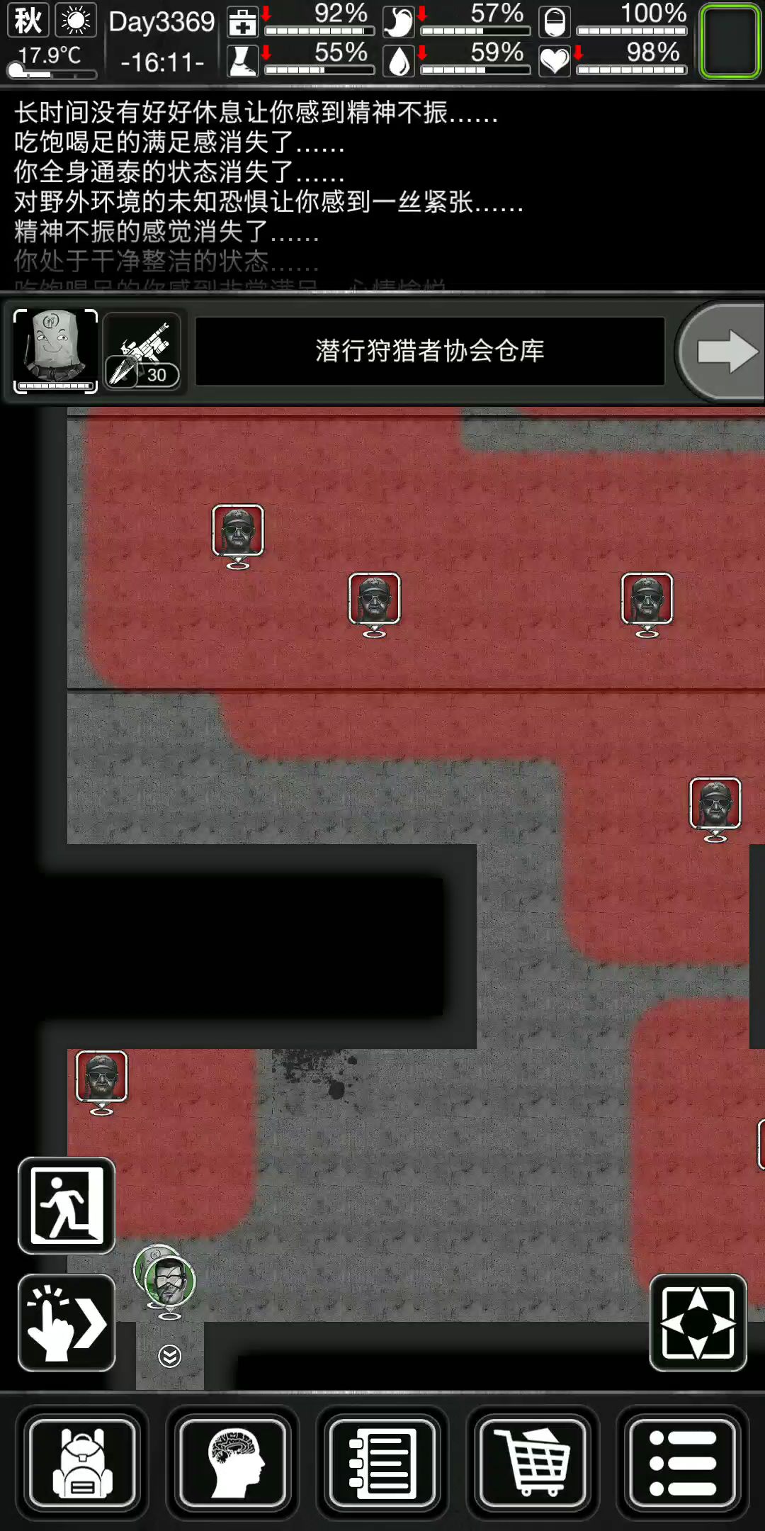 新年活动补偿任务的各级仓库守卫有4个掉落物品:布料,泡面,污水,破损的零件模组,布料可做破布绷带给詹姆斯邦回血,遇到1个守卫直接加速打,2个守卫后退一格让邦自动前进打都能无伤,只有3个普通或遇高级、精英守卫,顶在前的邦才可能受伤,自己可无伤