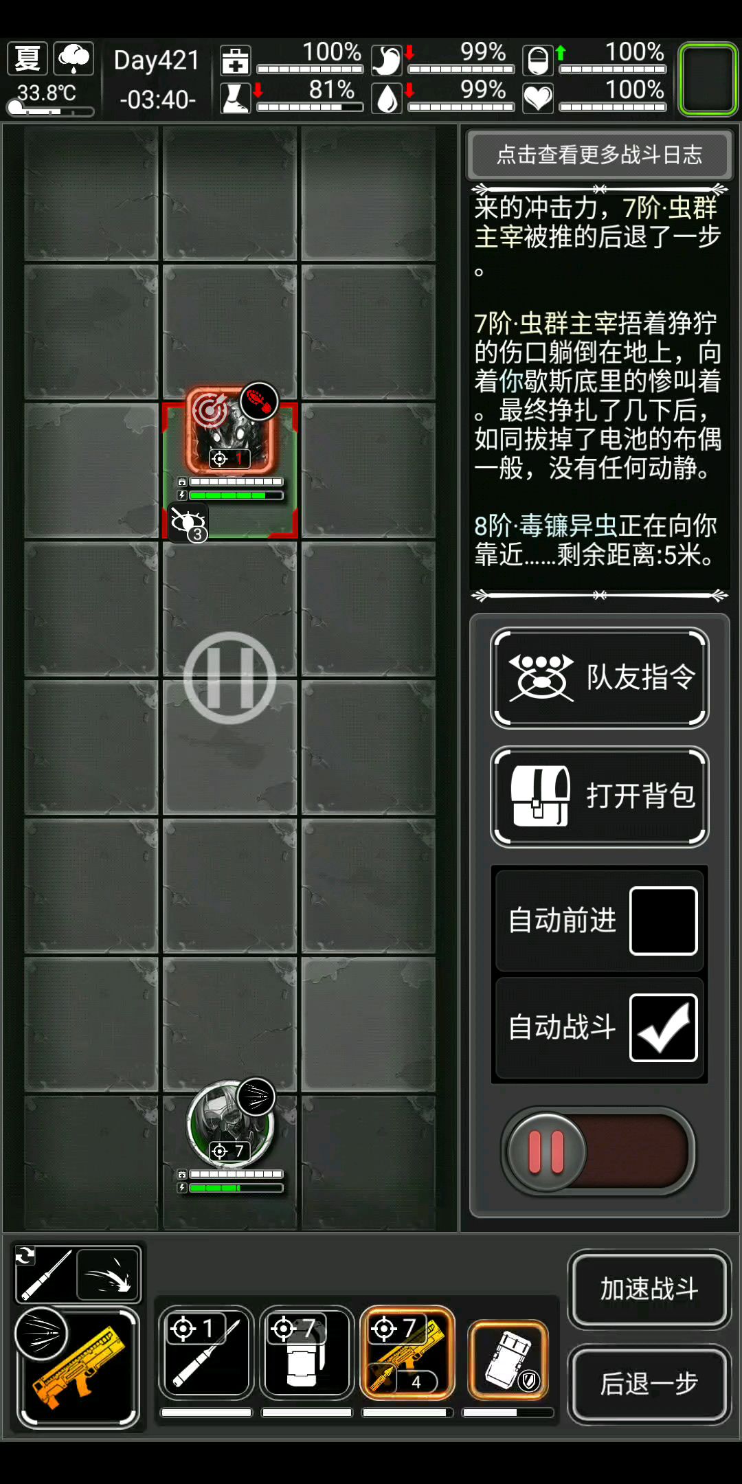 打法看视频,就是进进出出麻烦。做了两个八阶任务,开了一堆垃圾。打八阶感觉还是这个方法好用。游戏哪哪都好,就是战斗系统太恶心人,怪血多,狙伤害低,还要等待漫长的读条(开加速也慢)。战斗系统改一下,狙击子弹不限购就能一直肝了。