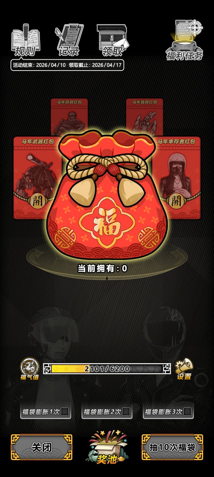 不是,你用了多少信用点啊,我看了下我的,一共花了19150信用点,3006个福袋,一共开出277个武器红包241个防具260个幸存者,268个载具。最终武器礼包24个,防具11个,幸存者12个,载具13个。充值最高档,开红包给40的福气值。武器都是开出最终礼包就重置,其余三个红包都是开满21个自动下一轮,基本上全程10连3倍到4个礼包开出来,然后不加倍抽完剩下的。但是我也就勉强凑两套了.....(武器多2个,防具缺1个,载具缺1个)。幸存者礼包按照你那个数值来看,8个皮肤+接近3套收藏品大约是20个礼包。活动我大概缺了30个任务没做.......但是整体上不至于差这么多啊..........