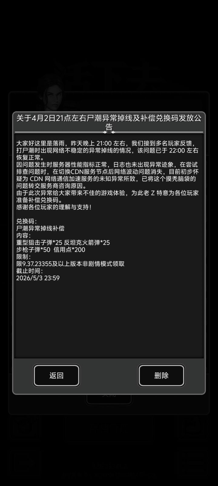 关于4月2日21点左右尸潮异常掉线及补偿兑换码发放公告大家好这里是落雨,昨天晚上21:00左右,我们接到多名玩家反馈,打尸潮时出现网络不稳定的异常掉线的情况,该问题已于22:00左右恢复正常。因问题发生时服务器性能指标正常,日志也未出现异常迹象,在尝试排查问题时,在切换CDN服务节点后网络波动问题消失,目前初步怀疑为CDN网络通信加速服务的未知异常所致,已将这个摸秃脑袋的问题转交服务商咨询原