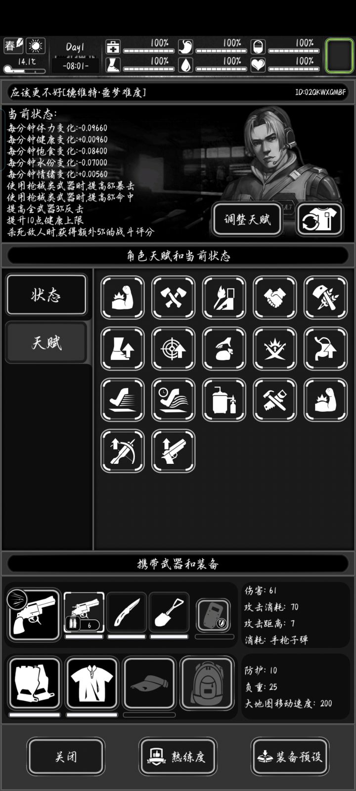 这是天赋和开局,然后我也是刚刚转官服,但这个帖子是记录的,所以不用说有啥好炫耀的呀啥的,单纯的一个记录贴,然后本期限制1 禁用近战武器2 禁用活动、和商城(除了商城里的活跃福利,希望大家理解一下)打完这2000天搞到生存点之后我就去记录一下炼狱噩梦的,提前谢谢大家到来,有什么好的建议都可以在这里提,谢谢大家啦!