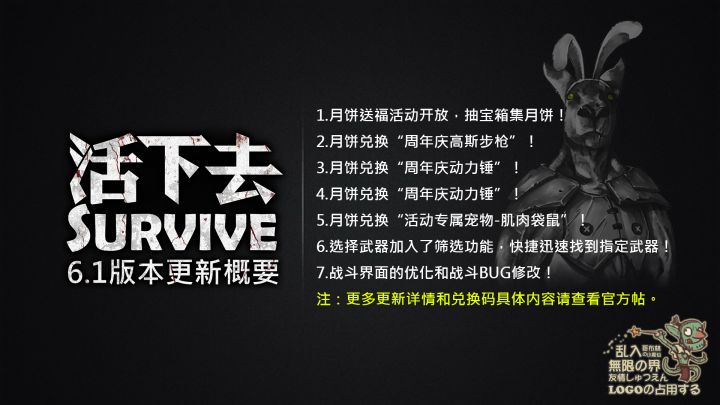 感谢大家对本次长生劫&活下去联动活动的支持,本次活动将于2019/08/01/12:00结束。奖励领取时间为:2019/08/01/12:00-2019/08/31/12:00在此期间仍可使用积分兑换道具,但不可通过任何形式再获取积分,并且可以领取联动专属宠物。2019/08/31/12:00后无法再兑换道具和领取宠物,请大家及时兑换道具领取宠物,避免造成积分浪费。--黑骑士工作室-201