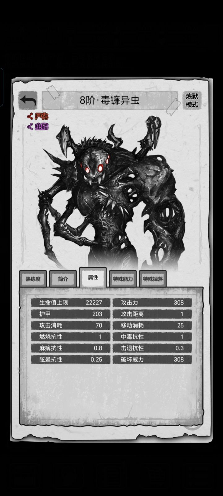 之前翻攻略,都说战旗模式八阶怪很简单。但到底多简单好像也没人说清楚。在我自己上手体验后。我悟了,原来如此简单。简单的跟打无尽、炼狱模式里的七阶怪一样。这里直接上图对比无尽、炼狱VS战旗。这里主要看血量就好,因为实际游玩中不管是战旗还是无尽、炼狱模式其实怪都破防不了我,就血量影响到游玩体验。(因为我是轮椅玩家,只会20修理包+龙鞭+蛇皮口袋+5绷带+骨套或者蛇年套出门)经过对比无
