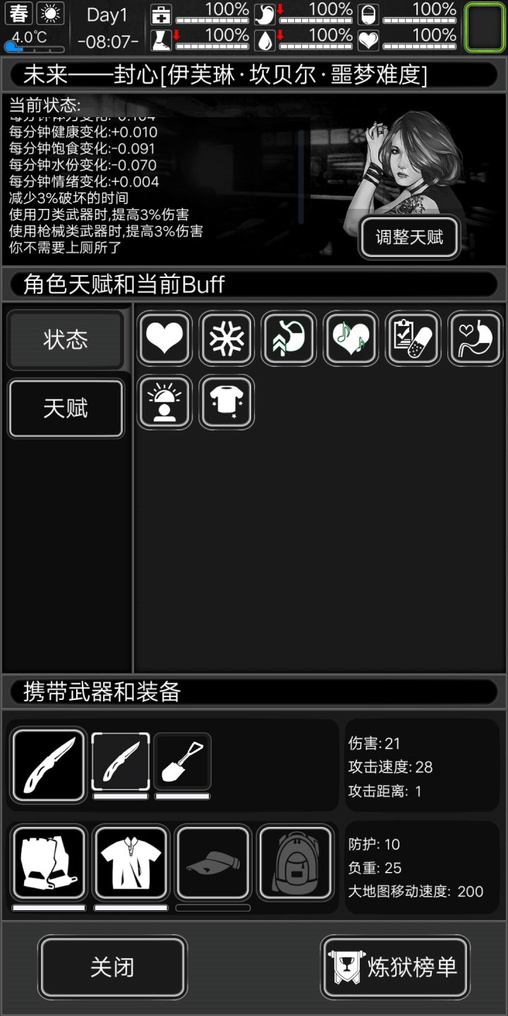 5.1版本炼狱难度大幅调整难度降低春季:(1天——46天)炼狱推荐角色氪金人物(开局送温暖)或者0氪可以选择记者。我们开局跟无尽一样选择污染区靠近中间的位置(安全屋不用管前10天搬走就行了)第一天推荐搜商场、医院、食品店、居民楼,养公园(因为前期需要农作物种子和制作雨衣还有熊皮大衣的材料)切记10天前不要拆家具第二天氪金人物过剧情 任务点资源点很富裕(为了方便我们直接跳过任务剧情)二