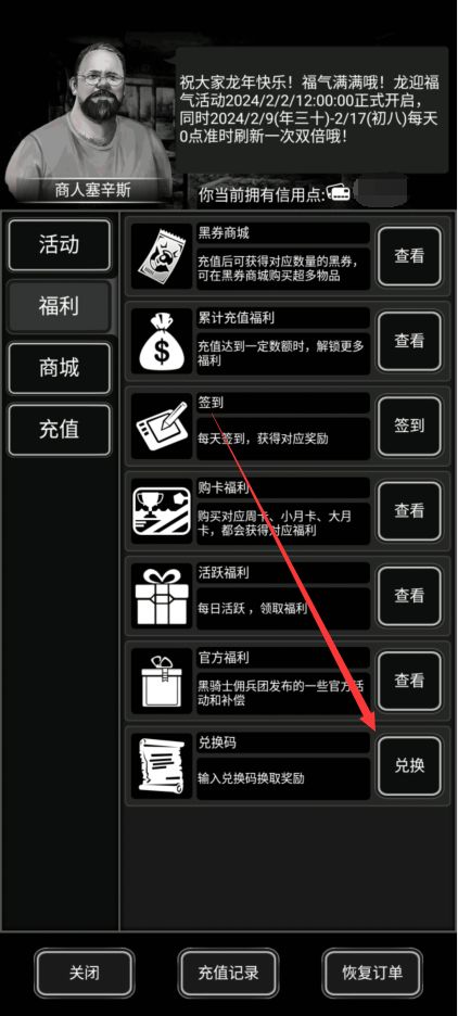 尊敬的幸存者们:黑骑士工作室全体员工祝大家春节快乐,马年大吉~2026恭贺新春活动[马上有福]将在2026/02/10 12:00至2026/04/10 12:00开启,活动奖励领取截止至2026/04/17 12:00。春节双倍充值在2026/02/15(廿八)至2026/02/23(初七)每日0点重置。春节福利兑换码活动活动时间:2026新年,除夕至初七每天可领取福利限制:限9.3