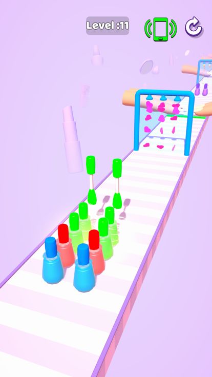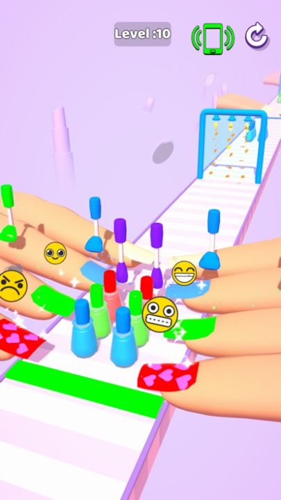 Move the right colors to the front to collect the nail varnish and paint the nails in the right color
