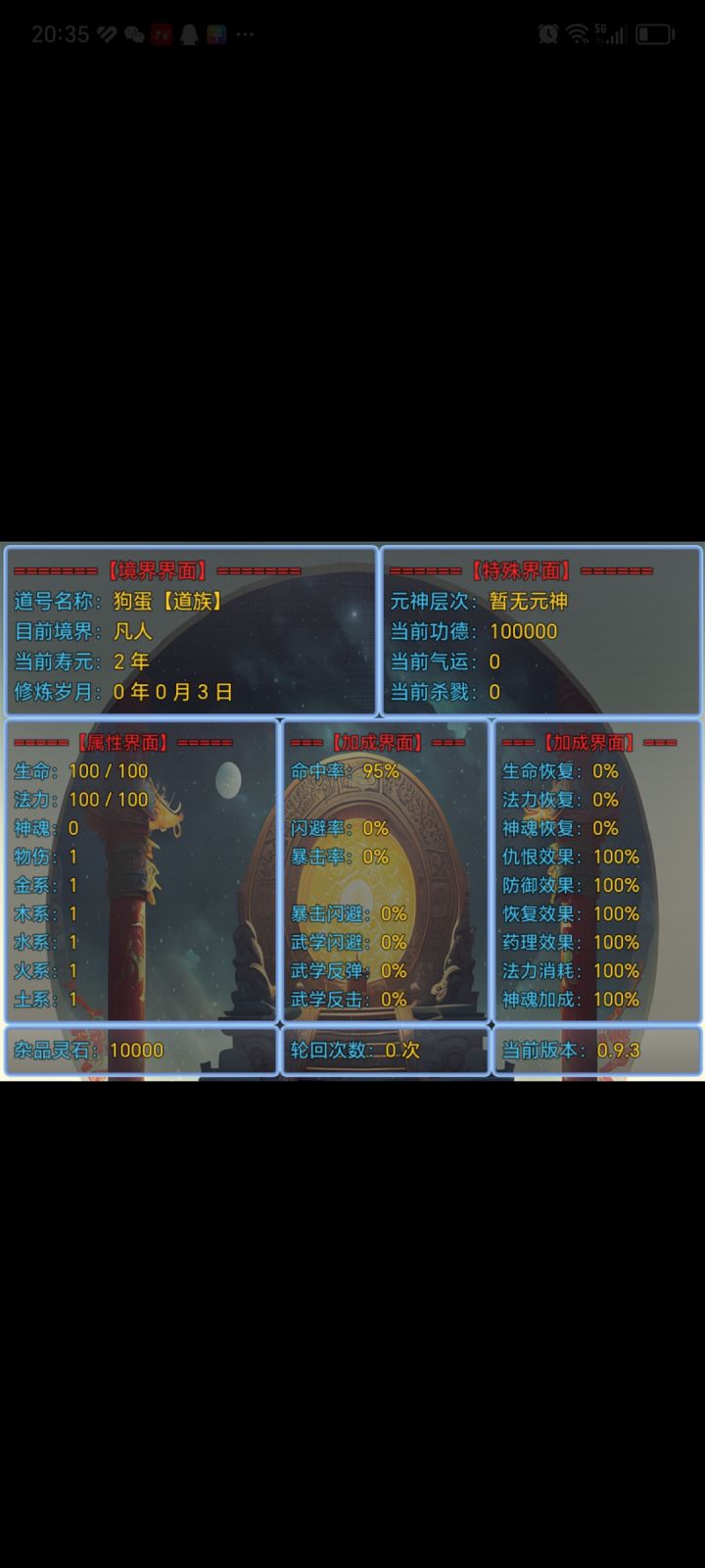 来吧宝贝们给你们一个前期的规划路线,开局道族,最好寿命长点!天赋善人+前世今生(牵扯到轮回可能会比较有用)。灵根全部顶级能百分百挂状态可以开启后续一系列任务拿到厨艺,凝气六层那个老怪物可以一直给他挂状态让他一次手出不了!然而并没有什么卵用因为我砍了他一晚上都砍不死后来才知道只需从他手上逃得性命就可以,然后找到黄石公学会第一个凝气境功法,但是现在很郁闷啊不知道这功法怎么修炼还在摸索中