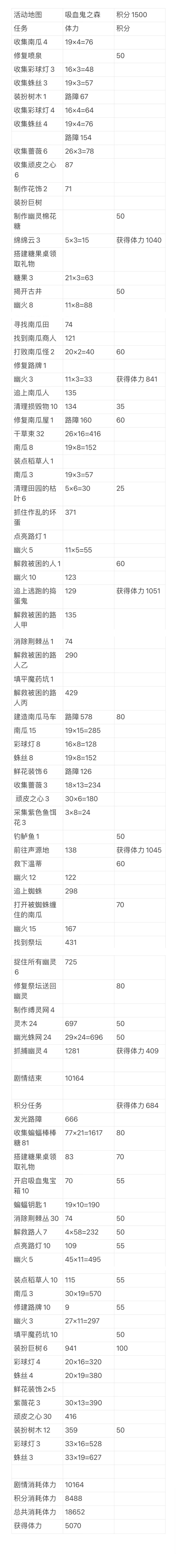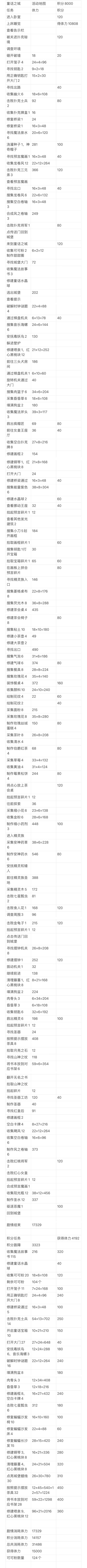 梦幻魔法屋 魔画密室 后续任务所需体力统计 目前已拿到前两个装饰,只剩最后积分大奖,楼主不打算冲了,但是想要倒数第二档的黄票积分奖励,故做此表格。【注意】此表数值不完全准确,仅供参考,还需大家一起来完善。H列数值越小越好。从清理占星椅开始,也就是从冲最终大奖开始,性价比非常低,大家酌情考虑。 1. 标黄部分我不知道用多少体力,随便找个数替代的,数值不准确,还请大家提供。 2. 点灯类任务捡体力消耗