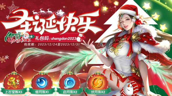叮叮当,叮叮当,铃儿响叮当,不知不觉间,一年一度的圣诞节已经悄然到来在此向各位仙友发放特别礼包!12月24日-12月31日!上线输入兑换码shengdan2023即可领取道具:上古宝券*5、烟月珠*1、启月珠*2、伏月珠*2