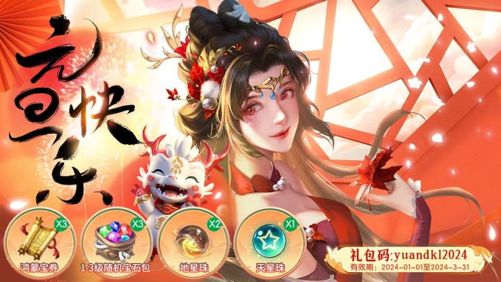 时间过得可真快啊!一年一度的春节已经悄然到来临~在此向各位仙友发放特别礼包!2月1日-3月31日!上线输入兑换码“chuxi882024”即可领取道具:战纹印玺*2、战场药水*2、boss通灵丹*2、历练符(5小时)*22月1日-3月31日!上线输入兑换码“xinniankl888”即可领取道具:鸿蒙宝券*3、随机宝石包*3、战场药水*2、聚魂灵火*2