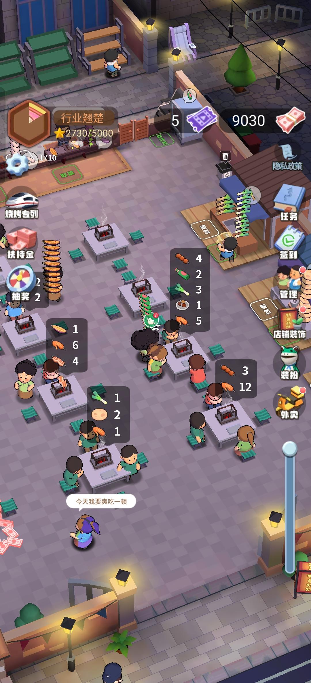 ?这个游戏就是搬运师傅搬食材,烧烤师傅烤,服务员上菜,客人吃,吃完收钱。