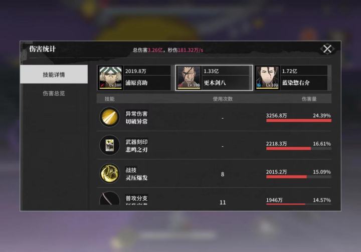剑八013,蓝染413,店长533,有四次乱轴小失误打3.2亿店长升633,其他保持不变,有四次大失误,剑八有两个大没吃到蓝染加成,而且剑八还少放一个大,蓝染有一个圈没满,同时一次封灭没有,也有三次乱轴小失误打了5.1亿如果全都没失误,一个店长6命就能让总伤提升一倍左右
