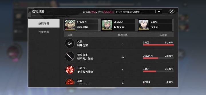 011银,111妮露,两个人刻印还都没满,75桩子,三分钟,2.26亿伤害,秒伤125万,过程还有失误,总伤害和秒伤是带同命座蓝染的两倍,蓝染刻印还是满的