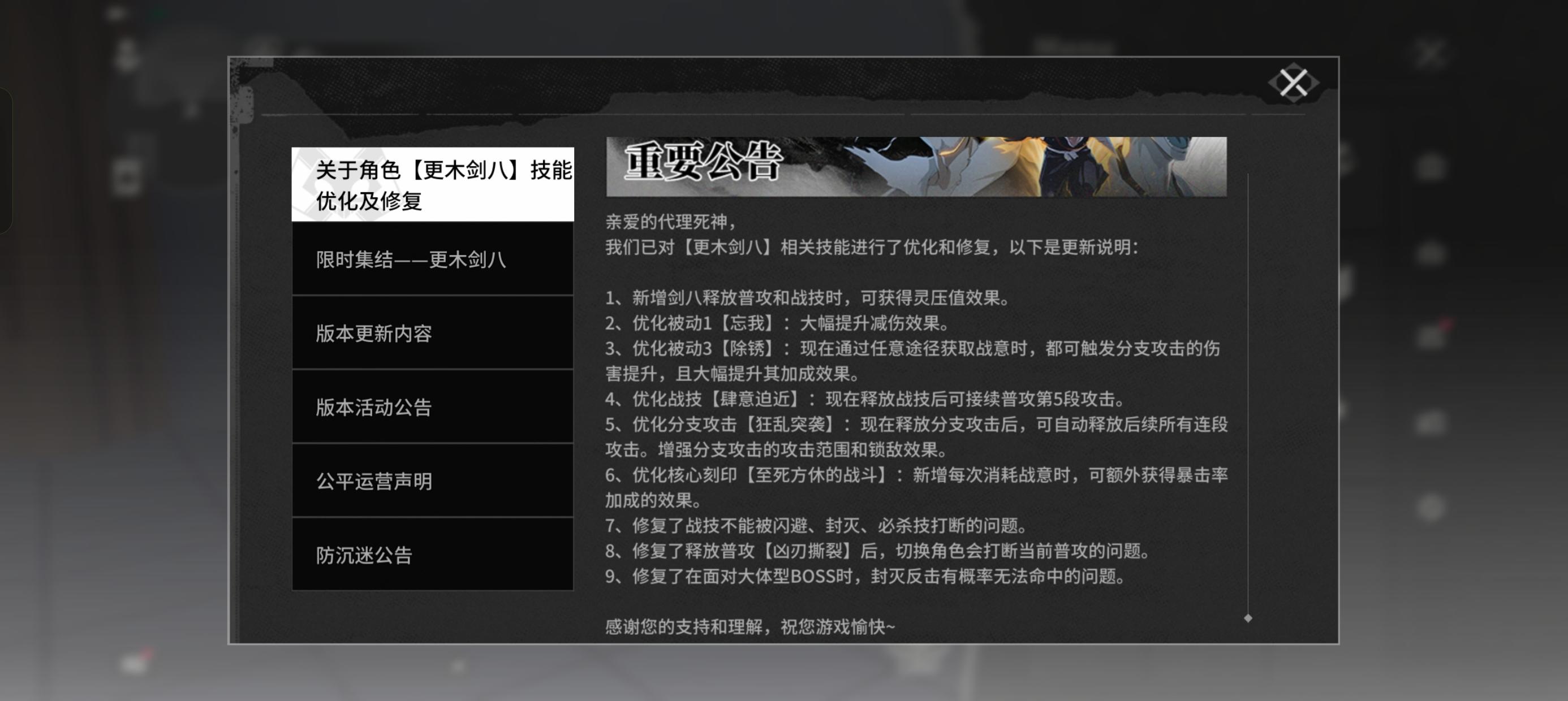 亲爱的死神代理人,我们已对【更木剑八】相关技能进行了优化和修复,重新登录后即可生效,以下是相关说明:1、新增剑八释放普攻和战技时,可获得灵压值效果。2、优化被动1【忘我】:大幅提升减伤效果。3、优化被动3【除锈】:现在通过任意途径获取战意时,都可触发分支攻击的伤害提升,且大幅提升其加成效果。4、优化战技【肆意迫近】:现在释放战技后可接续普攻第5段攻击。5、优化分支攻击【狂乱突袭】:现在