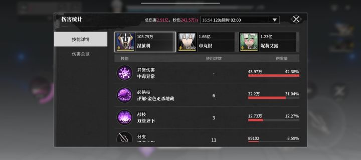 测试条件涅茧利 0+0+4,必杀充能250乱菊 6+5+5,必杀充能130自主训练80级怪时长一分钟尽管异常伤害可能存在不稳定性,但是从测试的结论基本定型,低明涅茧利 约等于 满命乱菊涅茧利抽亏增加店长测试,店长3命满专武满专刻,低命涅茧利已经比不过了,差距在20%左右,如果涅茧利也能到3命,满专武和专科情况下,在突队里应该超越店长辅助能力,但是差别预估也超不过20%但是一旦拿