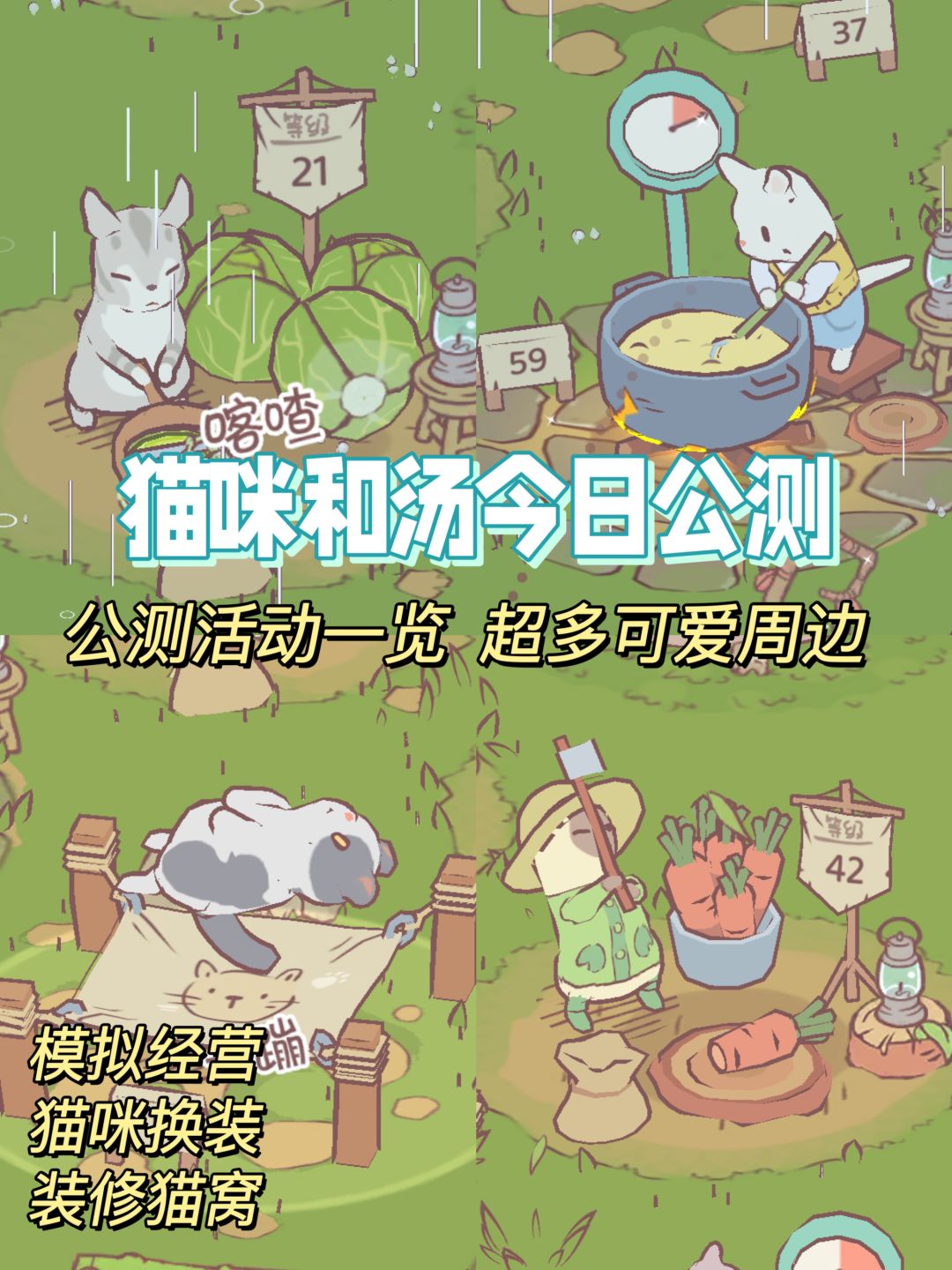 🎮游戏名称:猫咪和汤 💌游玩方式:安卓/ios 超级可爱的猫咪模拟经营游戏今天终于公测啦!有很多福利活动可以参加,我都整理了出来,喜欢的朋友不要错过啦! 游戏介绍: 在一个美丽的森林中,有一个猫猫大本营!它们每天的工作就是制作各种美味的汤,从原材料收集到烹饪,都是由猫咪们一手包办! 🌟超多品种的可爱手绘猫猫:在这个游戏里面,可以看到各种猫咪,包括布偶、缅因猫、英短、挪威森林猫等等;还可以给