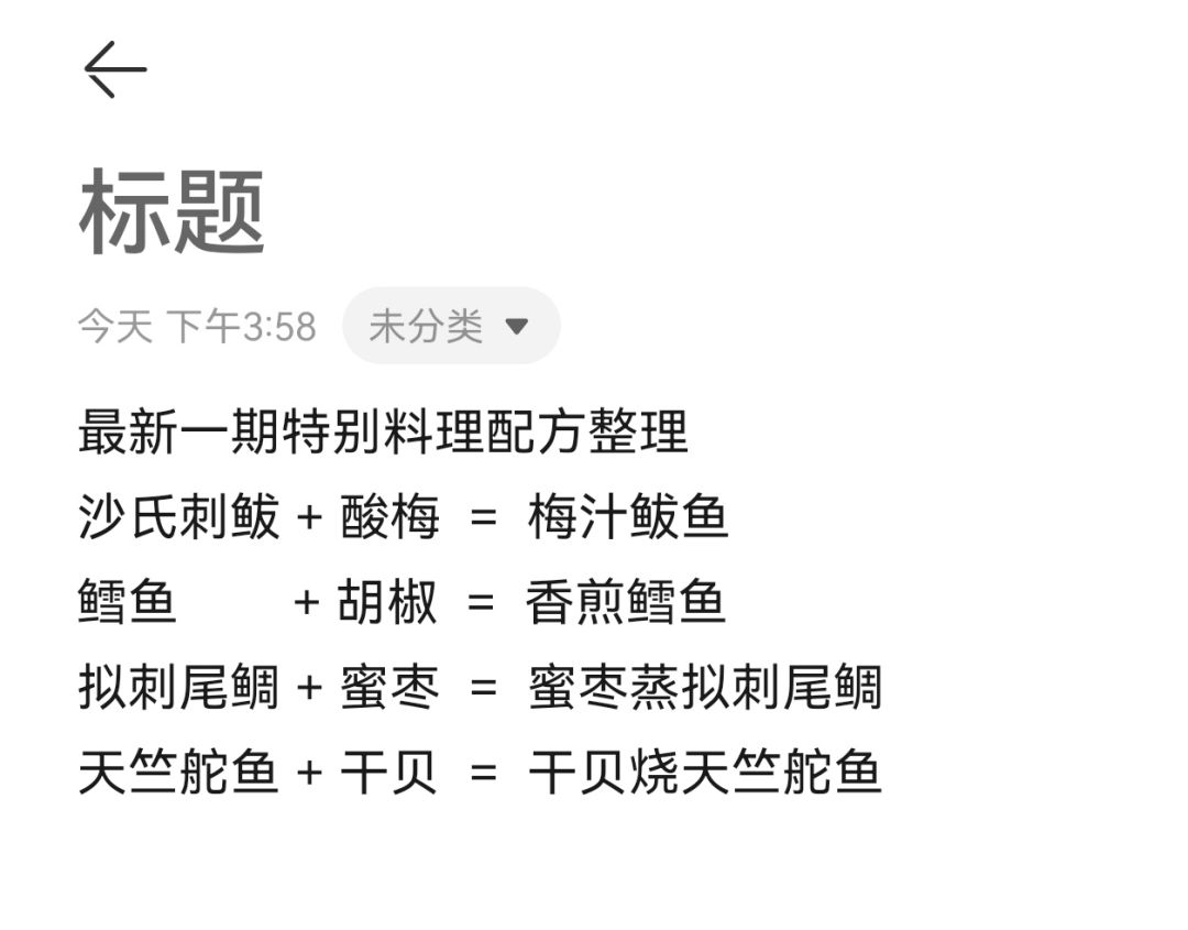 这次更新,特殊料理也增加了新的食谱,旅行随机给的食材也增加了。 新特殊料理食谱: 竹荚鱼+醋 蓝马林鱼+芥末 鲷鱼+茴香 比目鱼+冰糖 食谱总结图是小红书上的博主和评论区的小可爱们总结了出来的(已向博主授权,授权图在评论区) 🔴注:按图中食材制作不一定会必出特殊料理!!!(至于官方是什么概率咱也不清楚[表情_嫌弃]) #猫咪和汤攻略 #猫咪和汤 #猫咪和汤菜谱