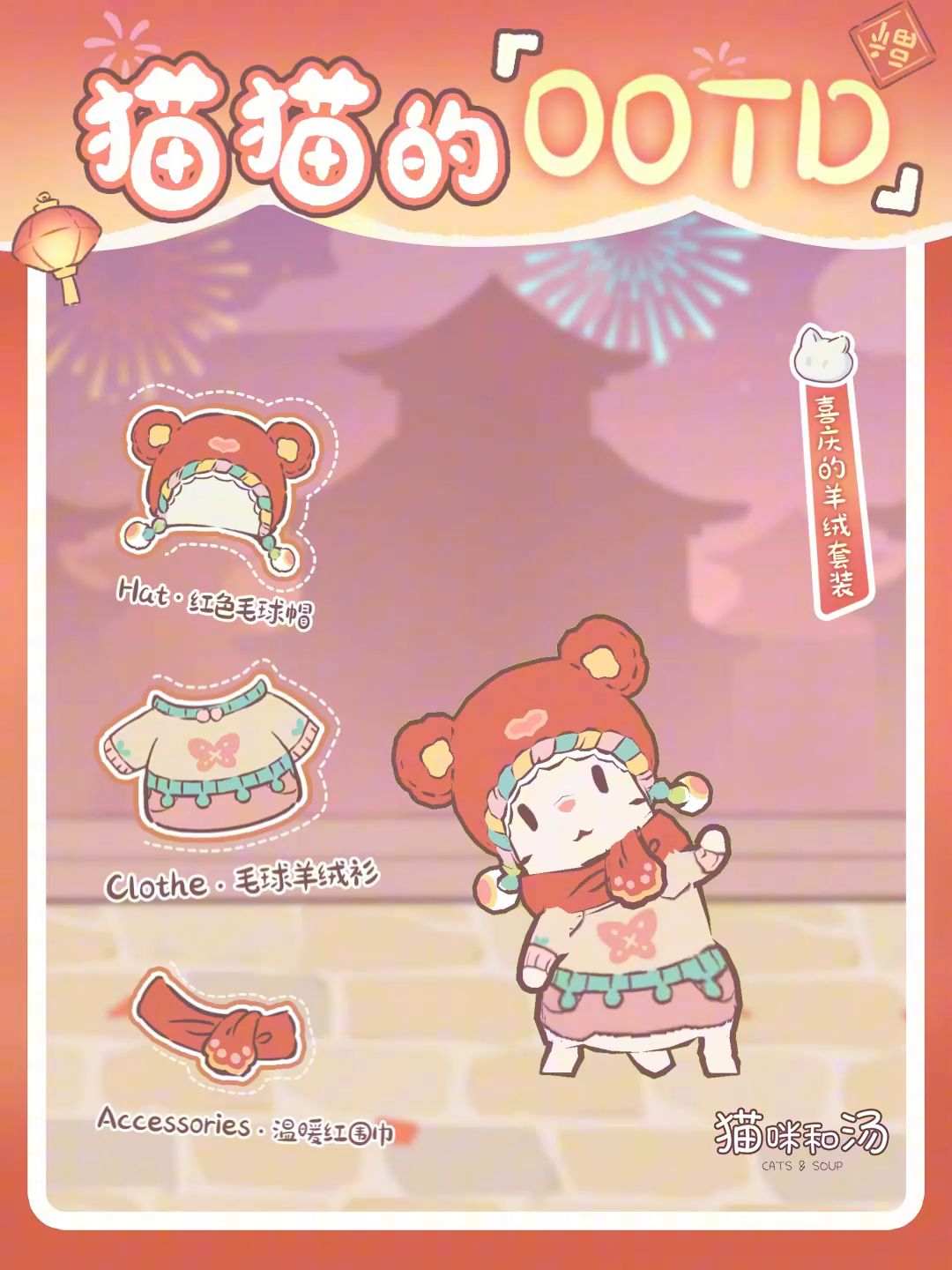 穿上可爱的红色羊绒套装,猫猫就是这个春节最可爱的喵~ 人类朋友,想不想捏一捏猫帽子上的毛球呢? 一个罐罐可以捏一次喵~ 💖 春节装扮「喜庆的羊绒套装」将在2月通行证中上线 ❣️ 此套装包含「温暖红围巾」&「糖葫芦」两个部件,人类朋友可根据场景自由切换穿戴喵~#猫咪和汤 #游戏日常 #发现好游戏