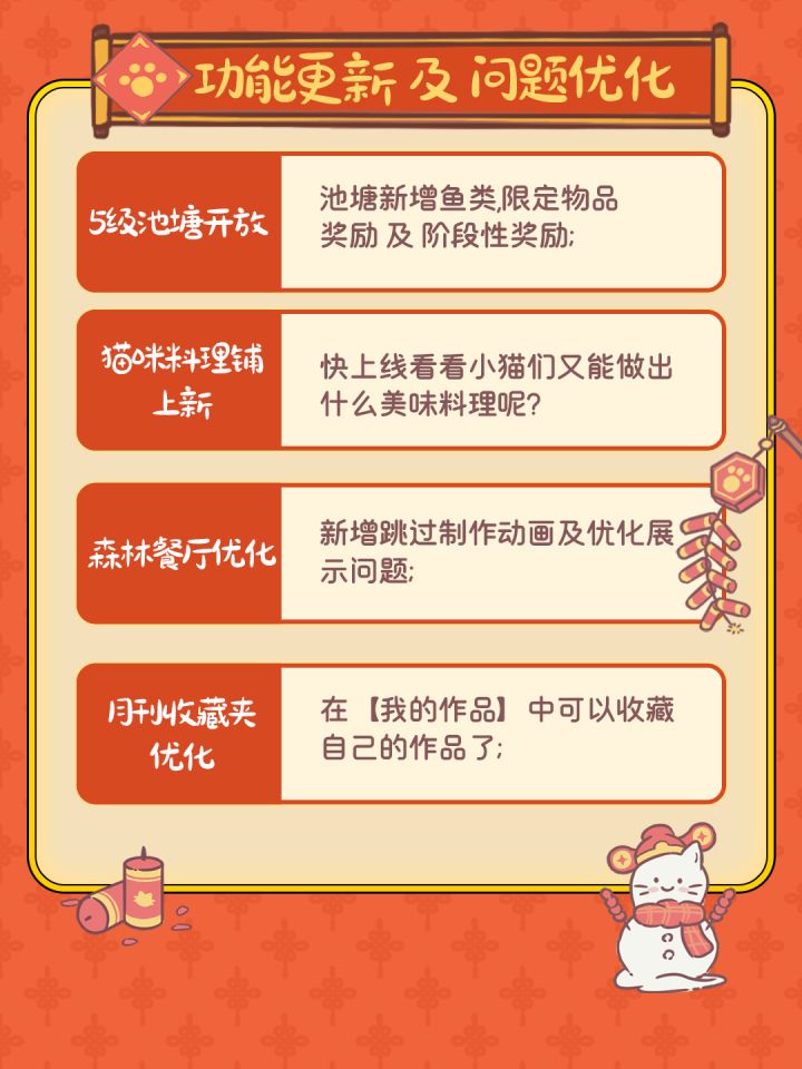 新春将至,猫猫们进货了一批新的烟花 小鱼的形状,代表新的一年富贵有余喵>< 记得贴上“并非食物 请勿食用”的标识哦 否则,可能会在点燃之前被某些小猫偷吃掉……喵…… 🧨 鞭炮设施皮肤「小鱼庆典」1月22日上架礼物商店喵~#猫咪和汤 #游戏日常 #发现好游戏