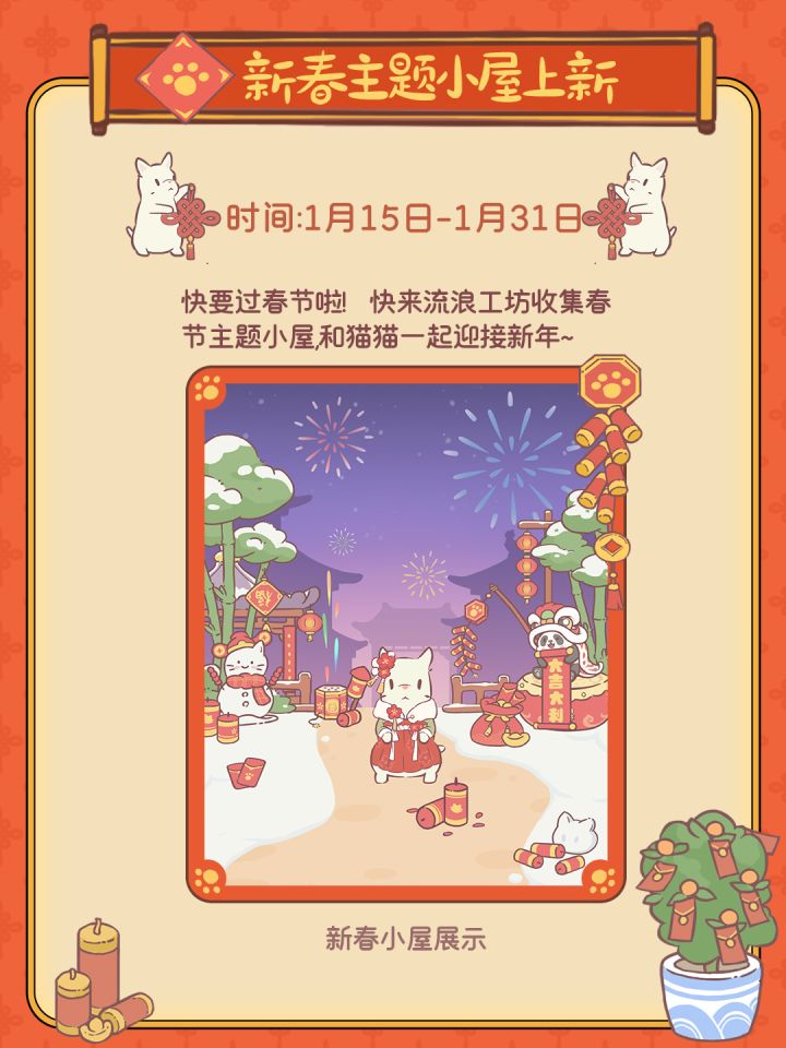 在雪地里扫出一条小径,路边的树上贴好福字 猫村的春节氛围感瞬间拉满! 抛开生活中的压力,管它什么考试什么工作 和猫猫一起在雪地里打滚,一起放烟花吧~喵~ 🏮新春猫小屋将于1月15日在流浪工坊登场喵#猫咪和汤 #游戏日常 #发现好游戏