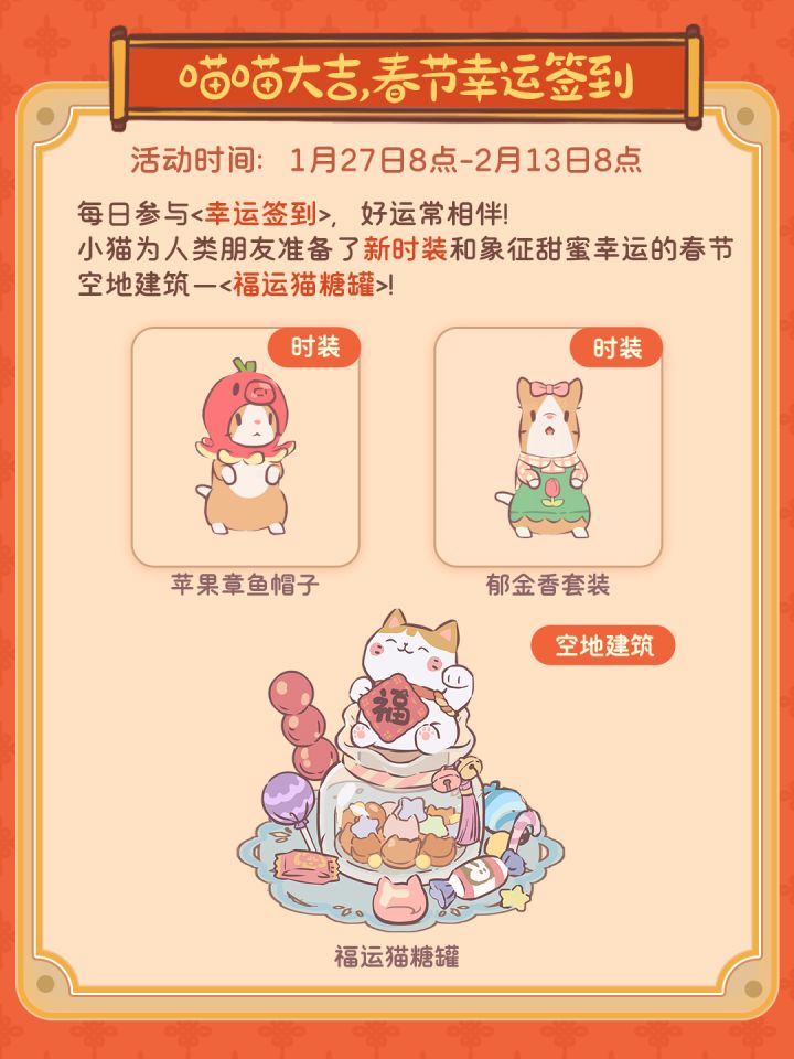 听说,猫在人类朋友眼中有招财的寓意 但发明家pawpaw觉得,只招财在功能上略显单调 于是,猫猫们一起制作了一只,又能招财又能招糖的可爱猫猫! 据说糖罐子里的糖果永远不会变空喵…… 😸 空地设施「福运猫糖罐」1月17日起可通过春节签到活动获得喵~#猫咪和汤 #游戏日常 #游戏日常