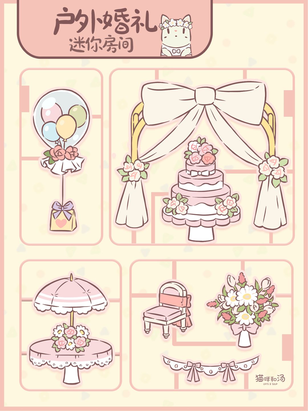 亲爱的人类朋友~ 您预定的「户外婚礼」系列组件已经送达 请按照您喜欢的布局,为小猫咪组装完美的婚礼现场吧~喵~ ——来自 喵喵喵专业搭建公司 💕上新预告:猫小屋「户外婚礼」系列家具10月1日上架,可以通过流浪工坊兑换获得喵~#猫咪和汤 #游戏日常 #发现好游戏