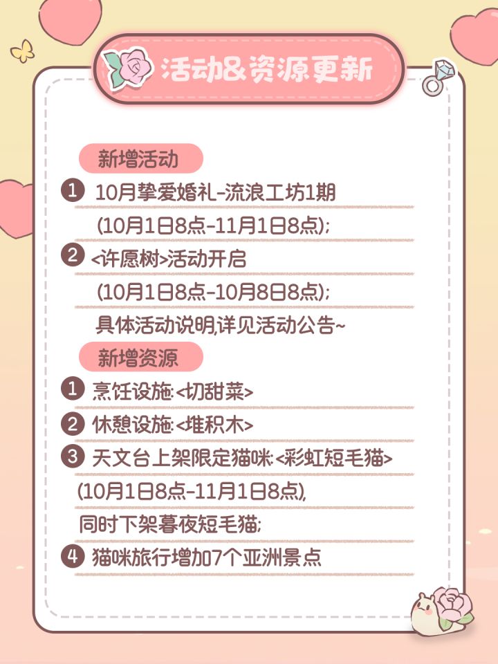 亲爱的人类朋友~ 您预定的「户外婚礼」系列组件已经送达 请按照您喜欢的布局,为小猫咪组装完美的婚礼现场吧~喵~ ——来自 喵喵喵专业搭建公司 💕上新预告:猫小屋「户外婚礼」系列家具10月1日上架,可以通过流浪工坊兑换获得喵~#猫咪和汤 #游戏日常 #发现好游戏