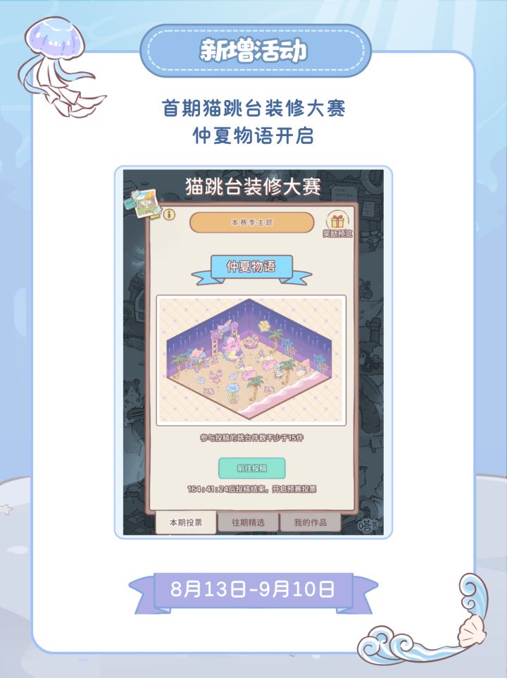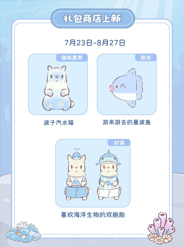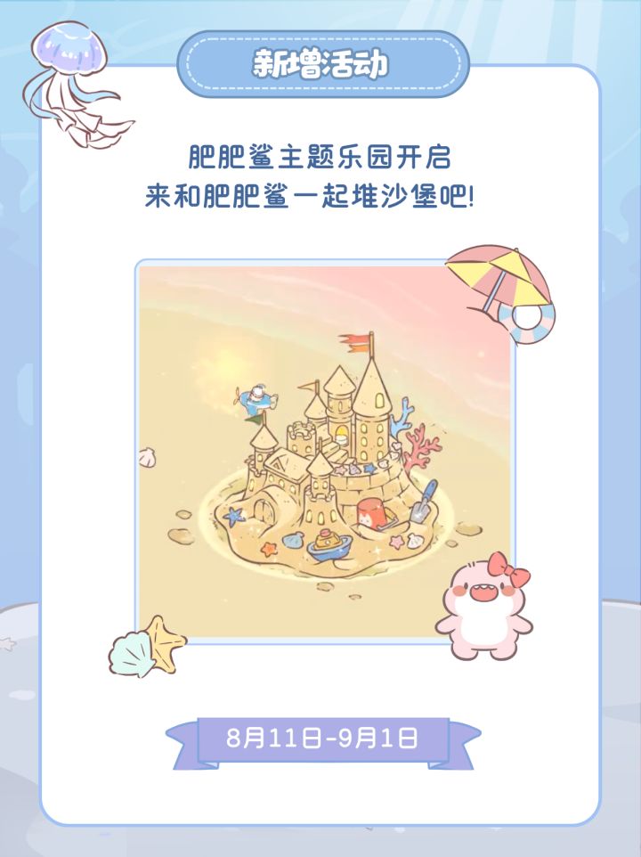 亲爱的人类朋友们:猫咪森林有新朋友来访啦~!和猫猫们&肥肥鲨一起,游览海底世界喵~为了迎接新朋友,猫猫工匠们需要对森林进行整修,通往猫咪森林的入口将于7月30日7:45~8:30期间暂时关闭。更新完成后,猫咪森林将再度开放,欢迎人类朋友光临【猫森特别活动】🏰 肥肥鲨主题乐园8月11日开启,来和肥肥鲨一起堆沙堡吧!🐾 首期猫跳台装修大赛8月13日开赛!分享你的夏日装修吧~【新增资源】🏂
