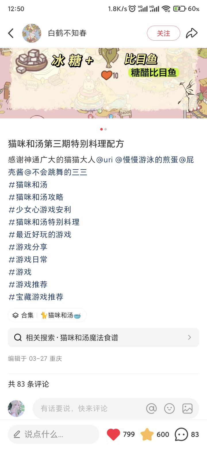 这次更新,特殊料理也增加了新的食谱,旅行随机给的食材也增加了。新特殊料理食谱:竹荚鱼+醋蓝马林鱼+芥末鲷鱼+茴香比目鱼+冰糖食谱总结图是小红书上的博主和评论区的小可爱们总结了出来的(已向博主授权,授权图在评论区)🔴注:按图中食材制作不一定会必出特殊料理!!!(至于官方是什么概率咱也不清楚)#猫咪和汤攻略 #猫咪和汤 #猫咪和汤菜谱