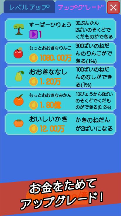 アプリを閉じている間も果物は落ちてきて自動で出荷されます。おカネが貯まった頃に戻ってきてさらに不思議な木をレベルアップしましょう!