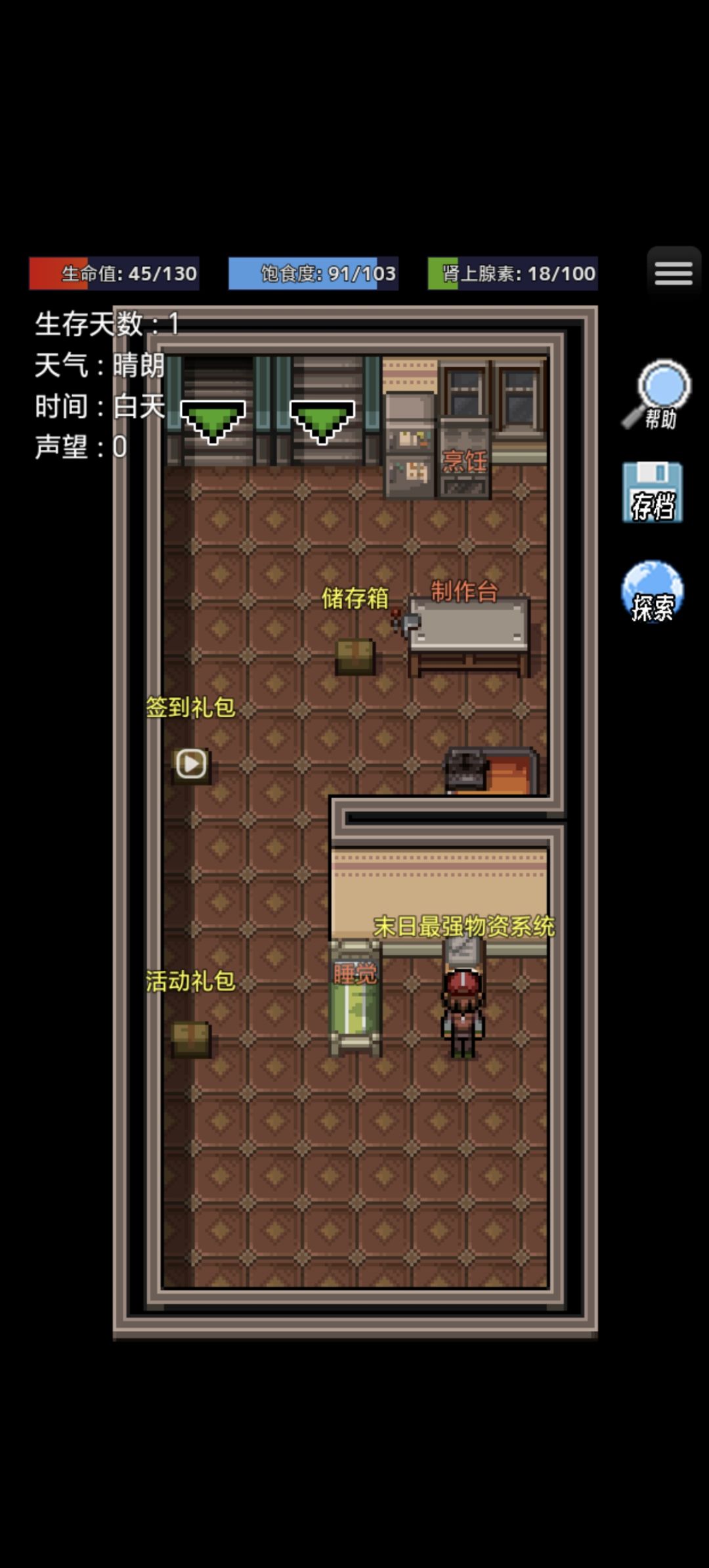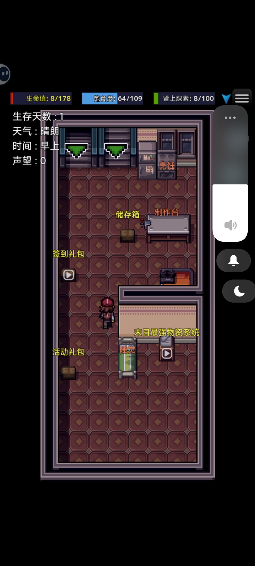 玩了两个多小时,这个房间随机刷新的,目前铁棍最强,可以三连击,没有血量可以在房间内睡觉回血,冰箱和地上的尸体是多余的,奖励少还会诈尸不值得,从99层到50层会重置一次看广告的机会,看广告要肾上激素就行了,有这玩意可以放技能。目前游戏内装备很少,东西也不是很多,制造最划算就是绷带和医疗包了。 到第十层会刷新700血量的BOOS的,脸黑第一队刷新普通怪物第二队就是BOOS了,这怪物不掉东西而且有时候会