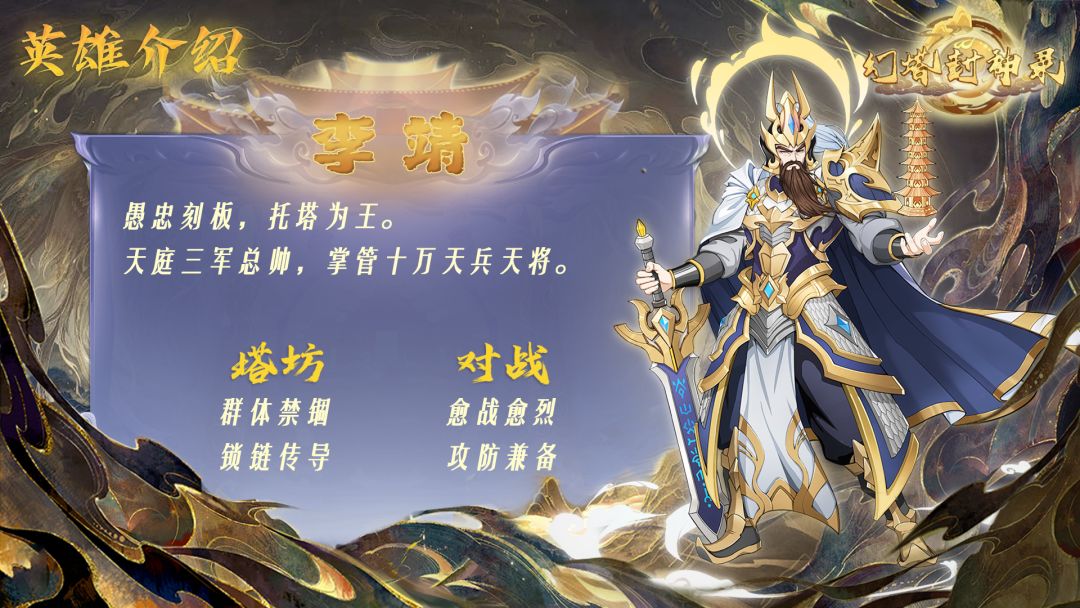 《幻塔封神录》预约通道现已火爆开启,欢迎大家前往游戏主页进行预约。 诸位道友好呀,小拂尘我今日路过藏书阁,偶得一卷宗。打开竟是游戏尚未公布的英雄资讯,且带有上线后的攻略技能,大家一定要点赞收藏哦! —————————卷宗封印条————————— 李靖 阵容:人族 英雄推荐指数:★★★★ 攻击类型:单体 英雄特点: 群体禁锢、伤害 禁锢怪物,高额伤害,既能C又能辅。 越战越勇,攻防兼备 狂暴吸血,