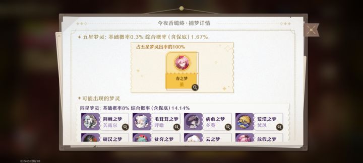 4、最后的最后再讲一下抽卡,概率见图1这个抽卡问题内测的时候就有看有老师说有问题,后面官方好像澄清了,但是也没看懂澄清了个什么玩意哈,就以我自己的抽卡来说,最欧的时候是50抽的时候出了活动梦灵,剩下时间比较充足,就再垫垫池子运气好点了,还能给个一命,最黑的那会儿,80抽出,70多抽出,我抽卡游戏也玩了不少 黑也不是没黑过,从来没黑成这样过,资源也紧张,很多梦灵就图一个有,零氪也只能这样,但话又说回来了,有个好处,这一个池子就活动梦灵一个金,不存在歪卡问题(哈哈)补充一下抽数是继承的