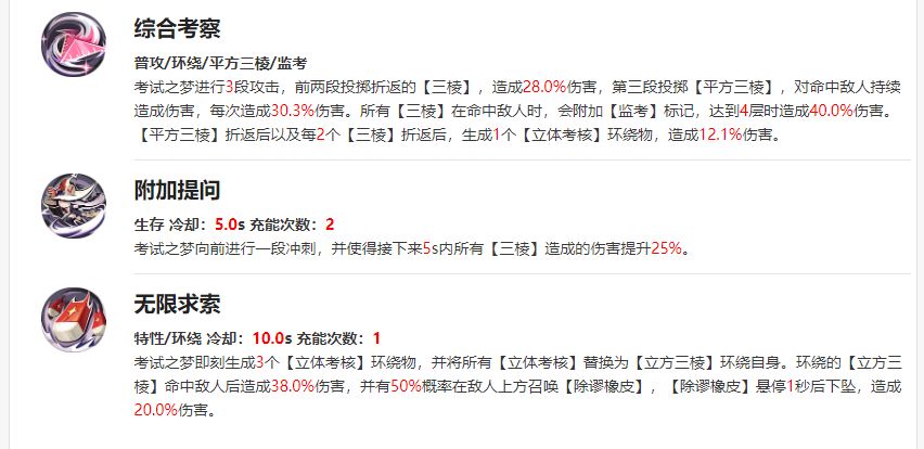 前提:不考虑考试当触发器,只考虑自己输出,触发器一堆没必要选她 一.技能分析 技能六种伤害,名字还像,前面我都不想看、没看懂,感觉大部分人也是这样,所以下面还是用变量简化下 三棱=a1 平方三棱=a2 监考=a3 立体考核=b1 立方三棱=b2 橡皮=b3 所以普攻就是:前两段a1第三段a2,a1a2都是叠a3状态,四层a3一次伤害,且a1a2返回会生成b1环绕 生存就是:给a1a2加伤5秒 特性