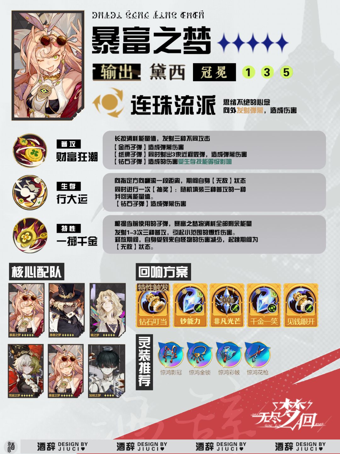 暴富之梦第一个up限定角色,强度极高,非常适合成为 — — 驻场主C 并且能根据专属回响走两个流派(普攻流,无限技能流) 以下为挑战模式的回响选择以及装备选择解析(看不懂可以先看我主页隔壁的进阶攻略) 一、技能解析(据图一) 暴富之梦存在三种子弹 主要伤害来源为钻石子弹(弹幕类型)伤害,并且无视格挡,附带有微量的 远距离伤害增加,暴击伤害增加 二·流派选择 根据回响效果选择其中 进阶回响: (钞